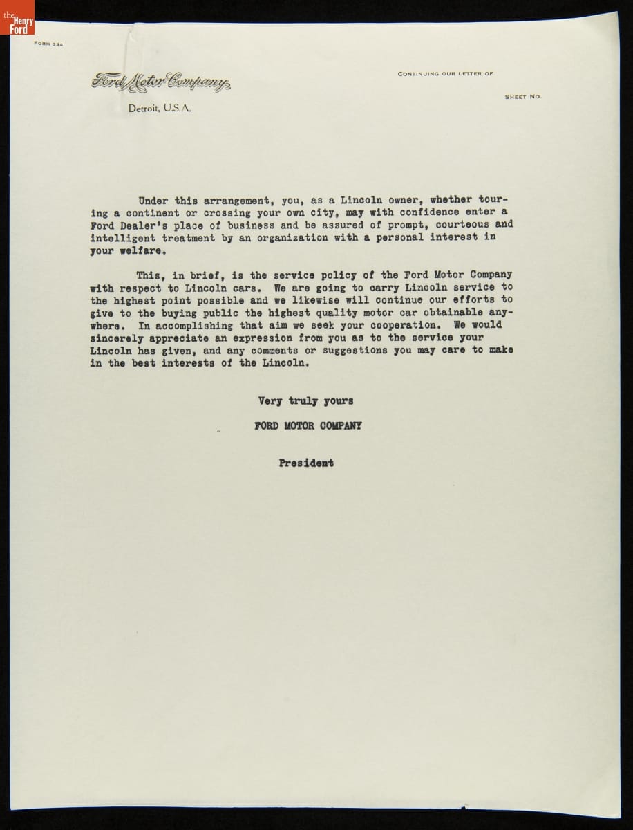Ford Motor Company purchased Lincoln Motor Company in 1922. It was a logical acquisition, as upscale Lincoln automobiles complemented Ford's basic Model T and expanded the company's market reach. This letter assured Lincoln owners that the full technical and financial resources of Ford Motor Company would stand behind their cars, ensuring prompt and professional service when necessary.
