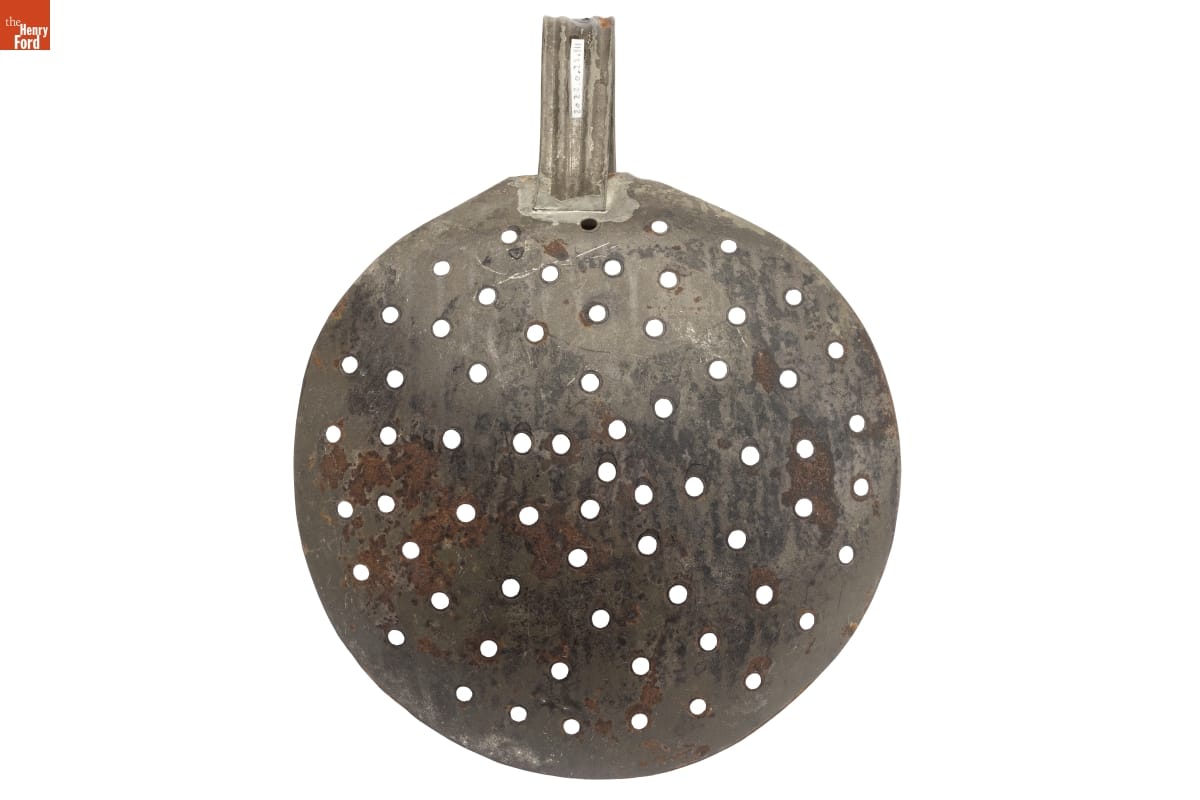 Cooks used flat sieves like this skimmer to remove foam that forms on the top of boiling liquids, or cream from the top of cooled whole milk. This skimmer consists of flattened sheet metal, pierced, and then riveted to a wrought-iron handle. Cooks kept the skimmer close-by, hanging it from a hook by the curve at the end of the handle.