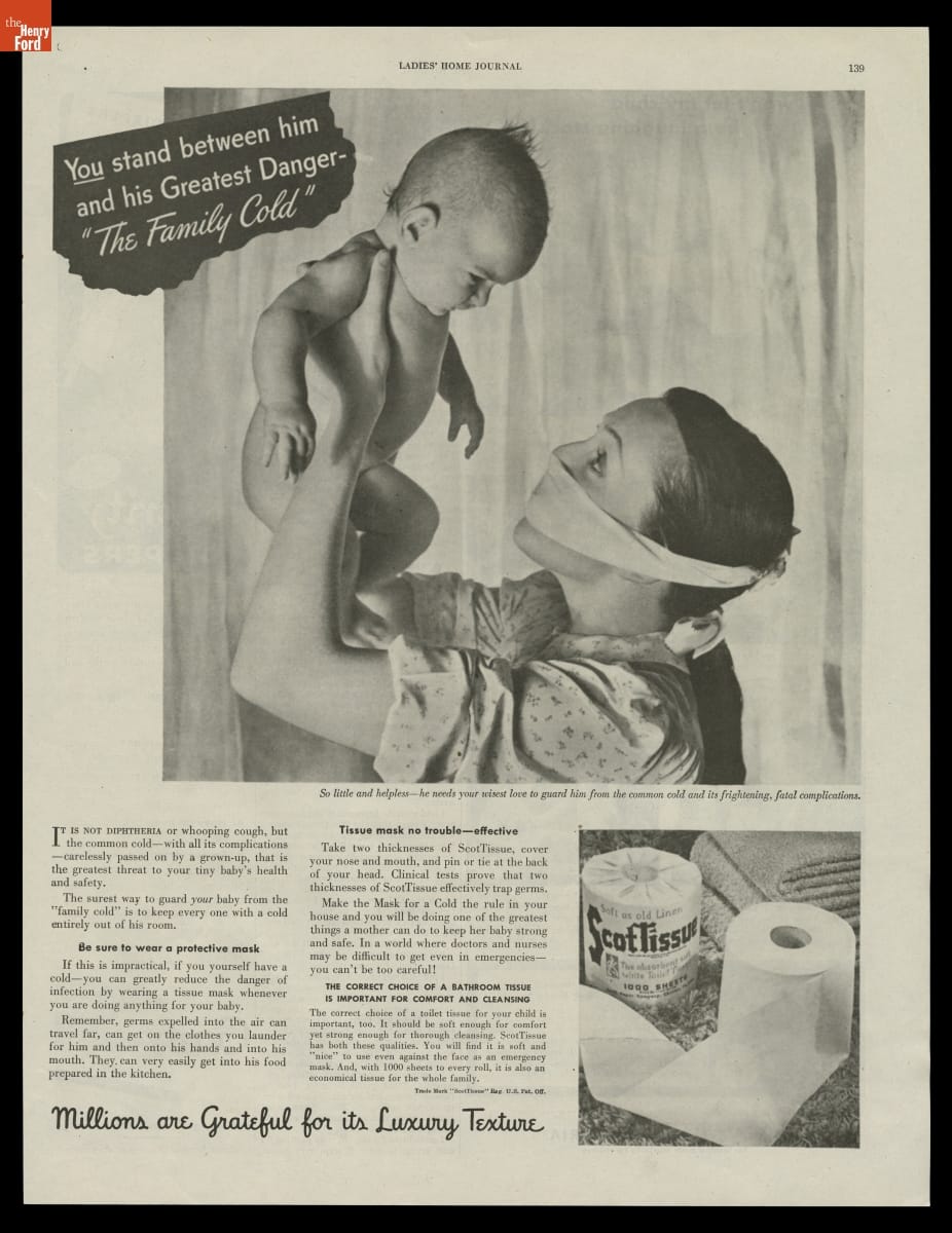 Advertisement for ScotTissue, "You stand between him and his Greatest Danger- 'The Family Cold,'" 1945