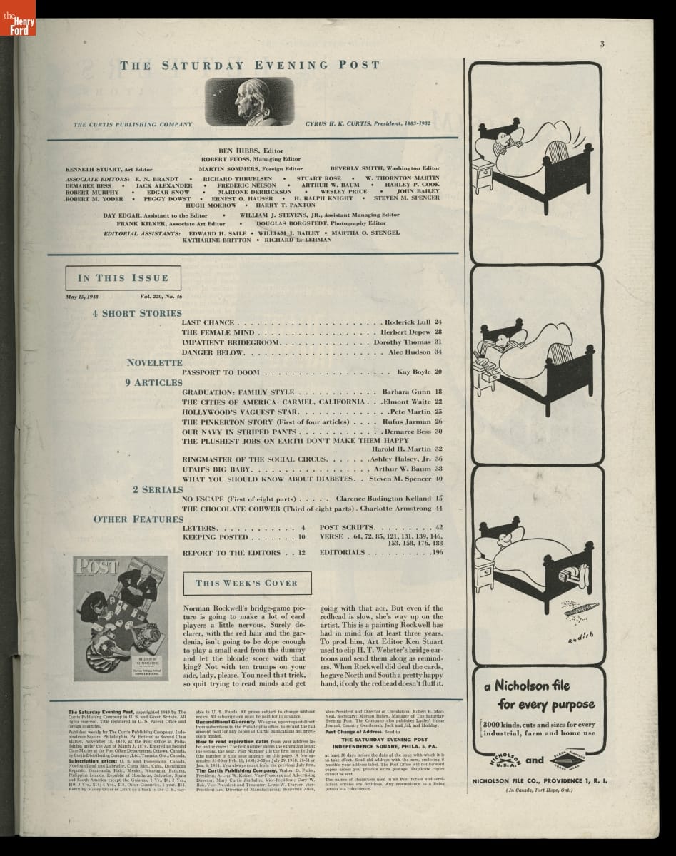 The Saturday Evening Post, first published in 1821 as a four-page weekly newspaper, became one of America's most popular weekly publications by the mid-1900s. The magazine contained news, commentaries, fiction, and general interest articles. But its most distinctive feature was its front cover illustrations by artists such as George Hughes, John Falter, J.C. Leyendecker, and Norman Rockwell.