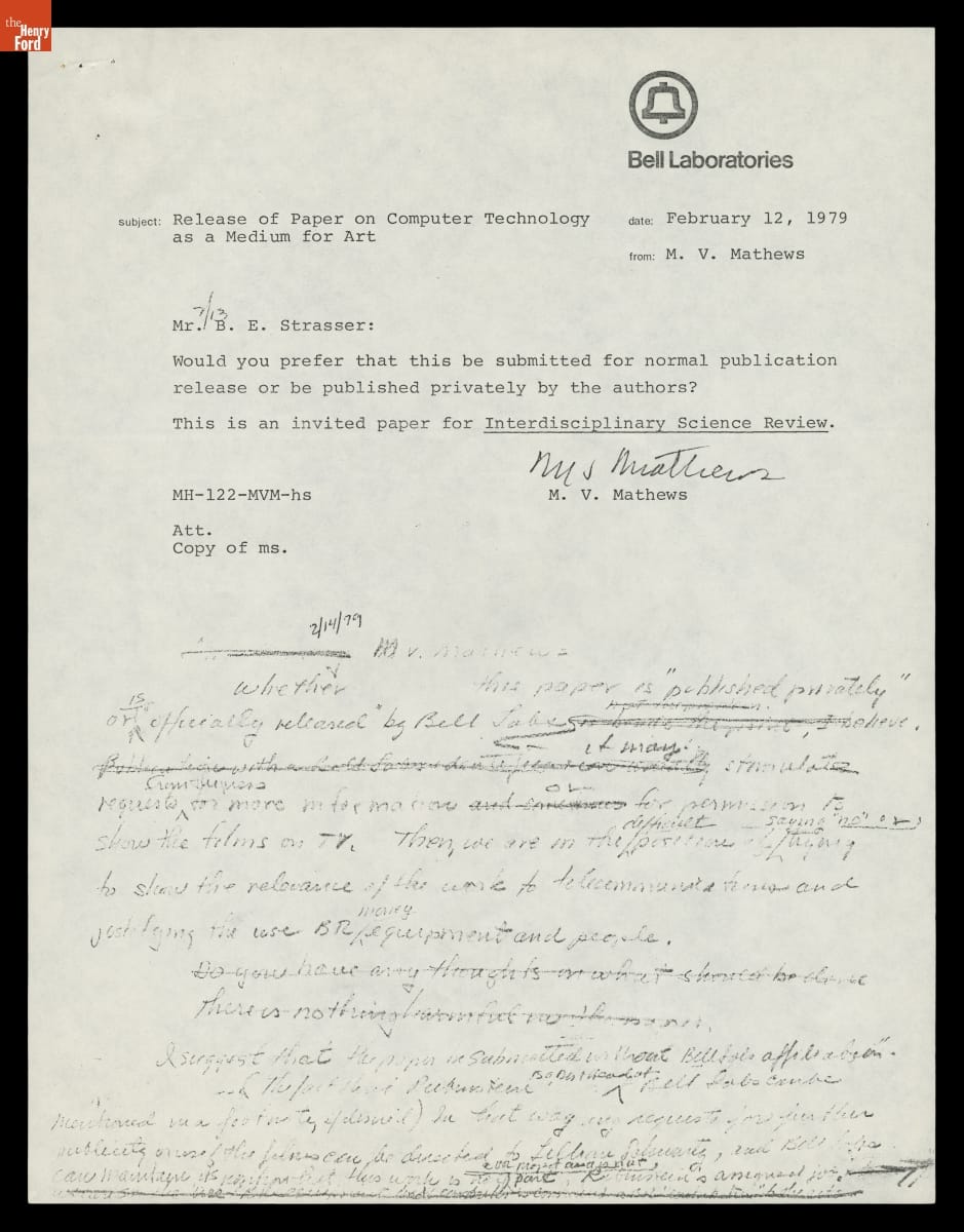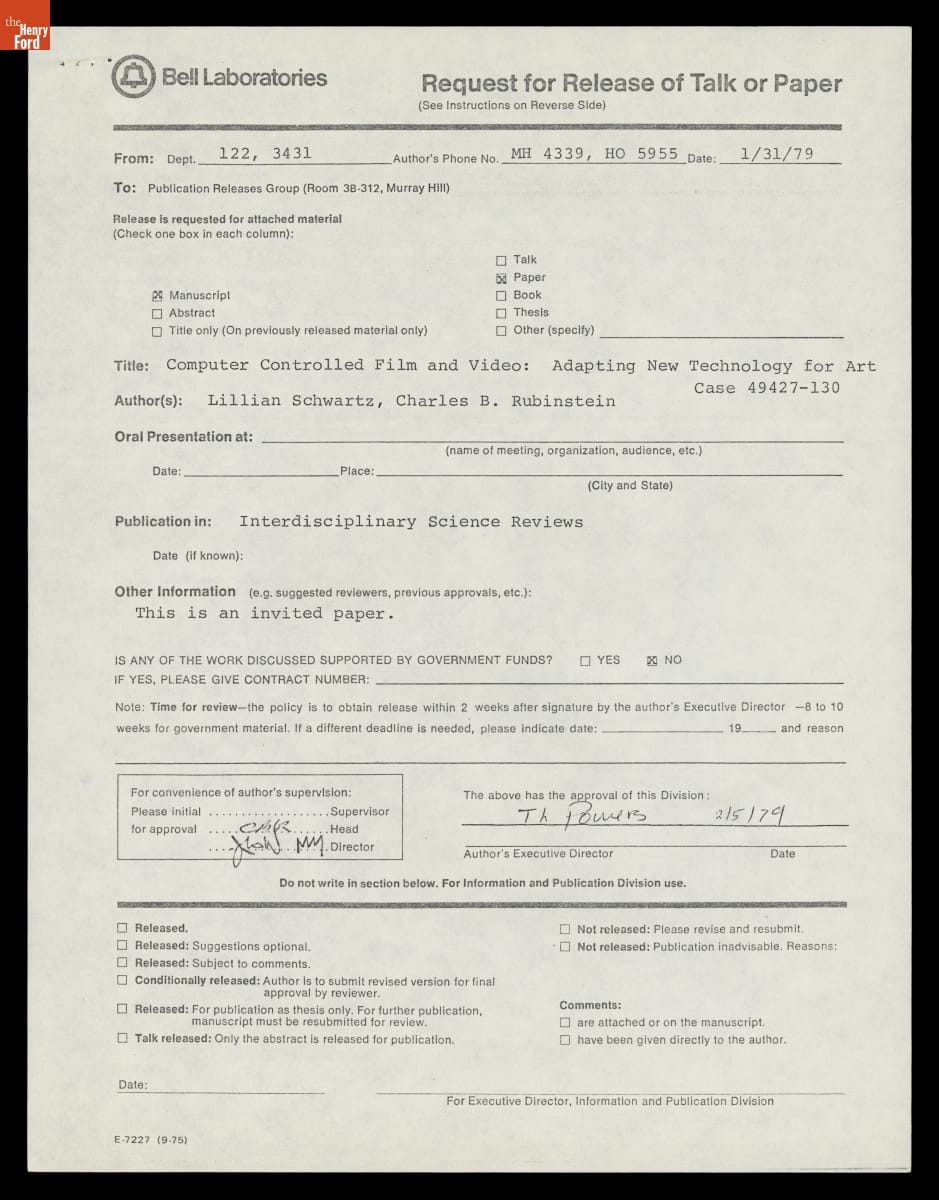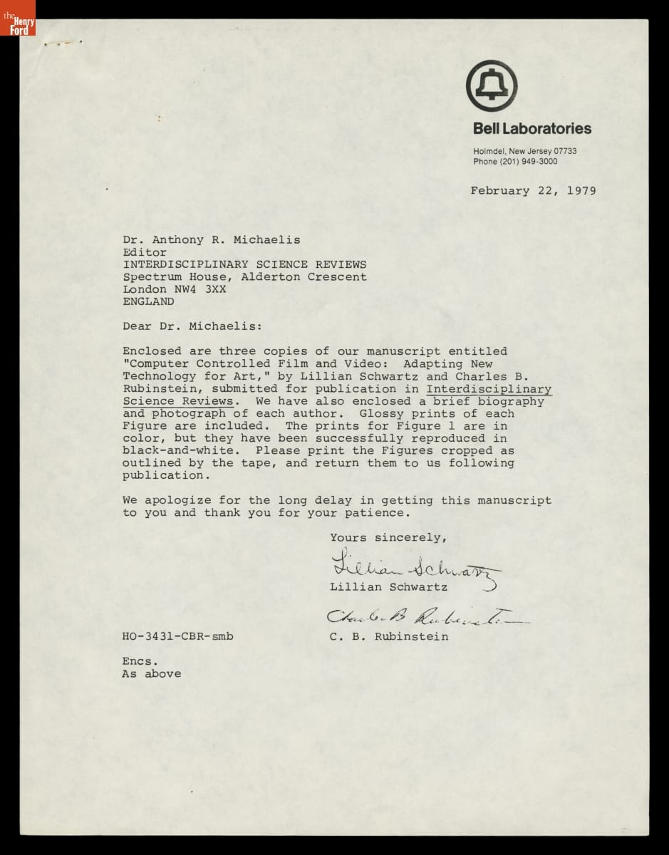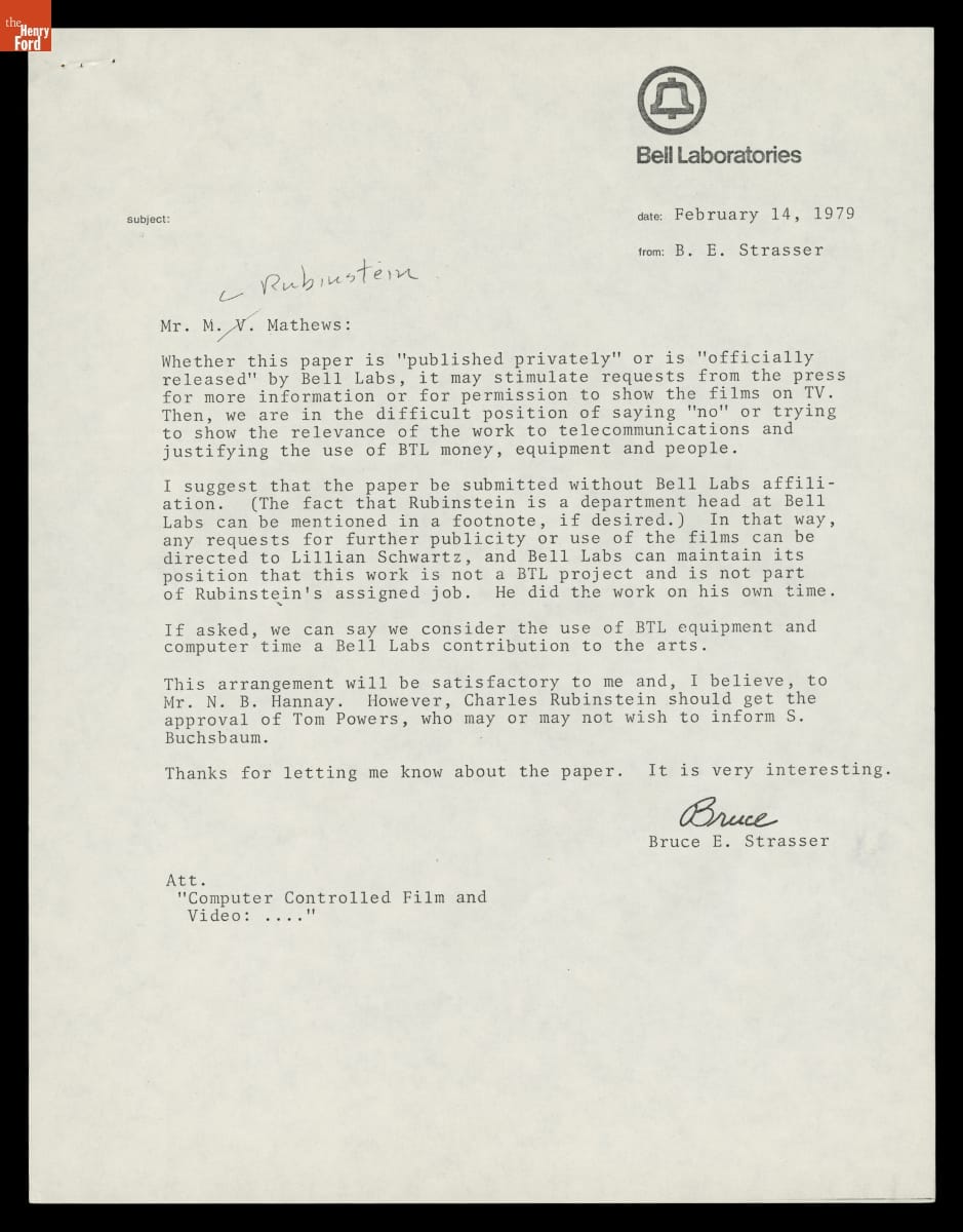 Correspondence about Publishing Bell Laboratories Research on Computer-Generated Film and Video for Art, 1979