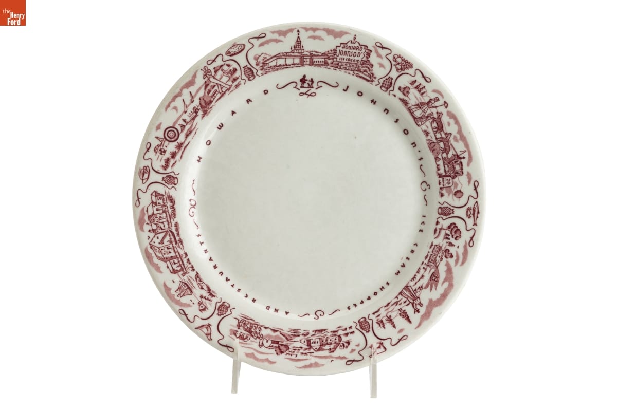 In the 1920s, Howard Deering Johnson began selling ice cream from food stands around Boston, Massachusetts. Johnson later expanded his business to full-service restaurants. He franchised these orange-roofed establishments across America, locating them along highways to cater to the traveling public. This plate celebrates America's growth with idyllic scenes on the rim, including one of a Howard Johnson's restaurant.