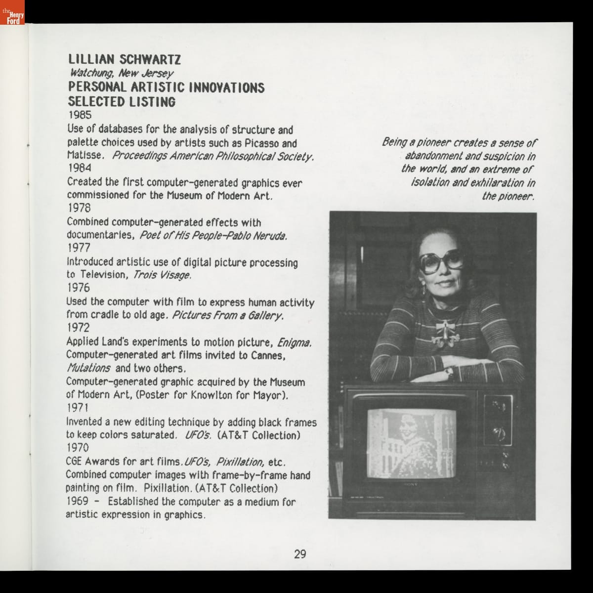 Lillian Schwartz is a pioneer of computer-generated art. From 1969-2002, she was a "resident visitor" at Bell Laboratories, producing groundbreaking films, videos, and multimedia works. The Schwartz Collection spans Lillian's childhood into her late career, documenting an expansive mindset, mastery over traditional and experimental mediums alike--and above all--an ability to create inspirational connections between science, art, and technology.