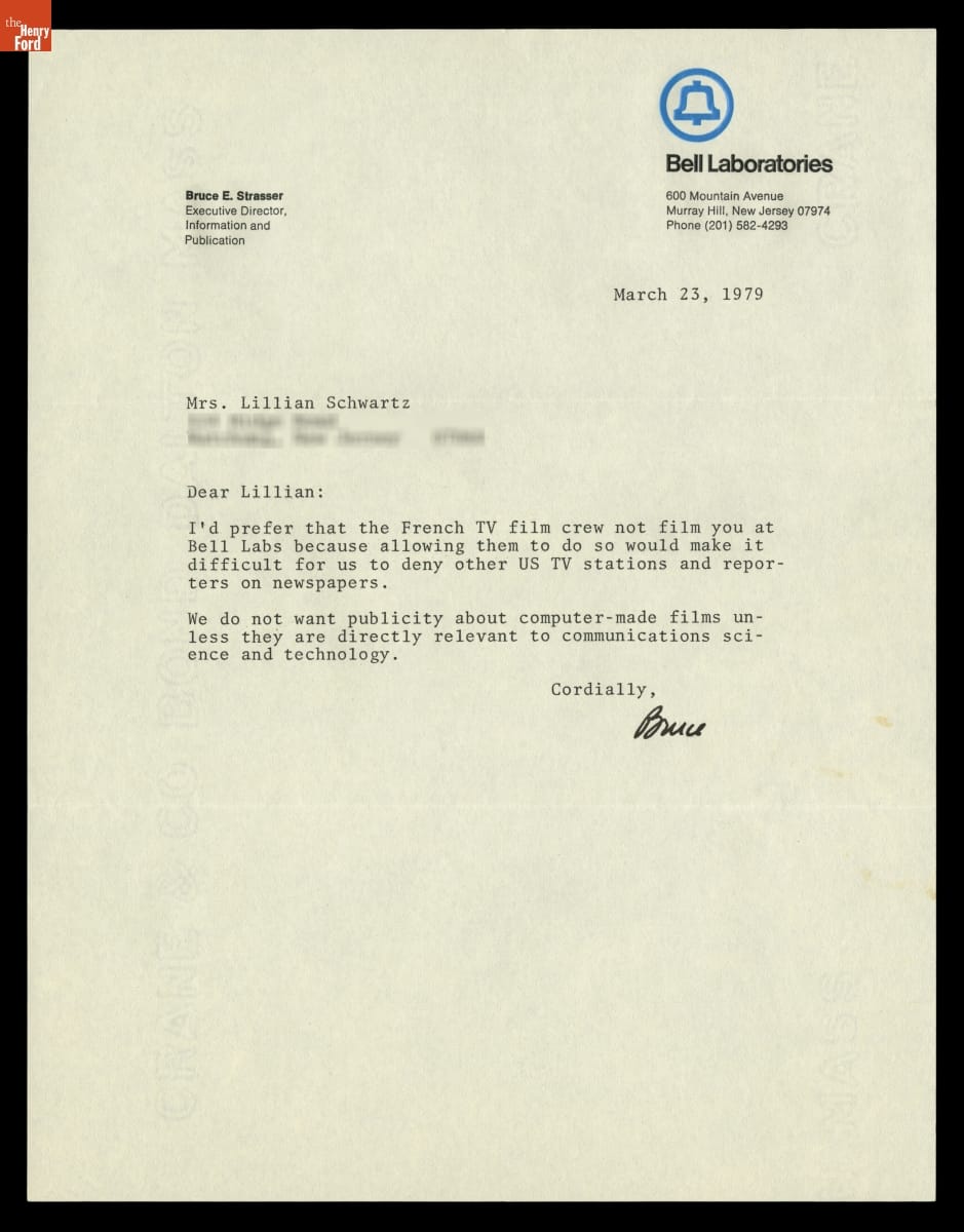 Letter to Lillian Schwartz from Bruce Strasser of Bell Laboratories, March 23, 1979