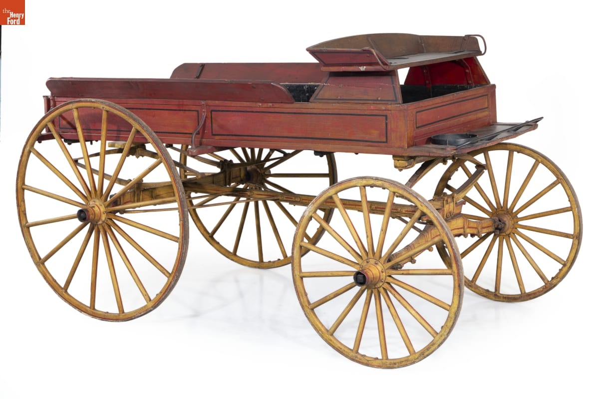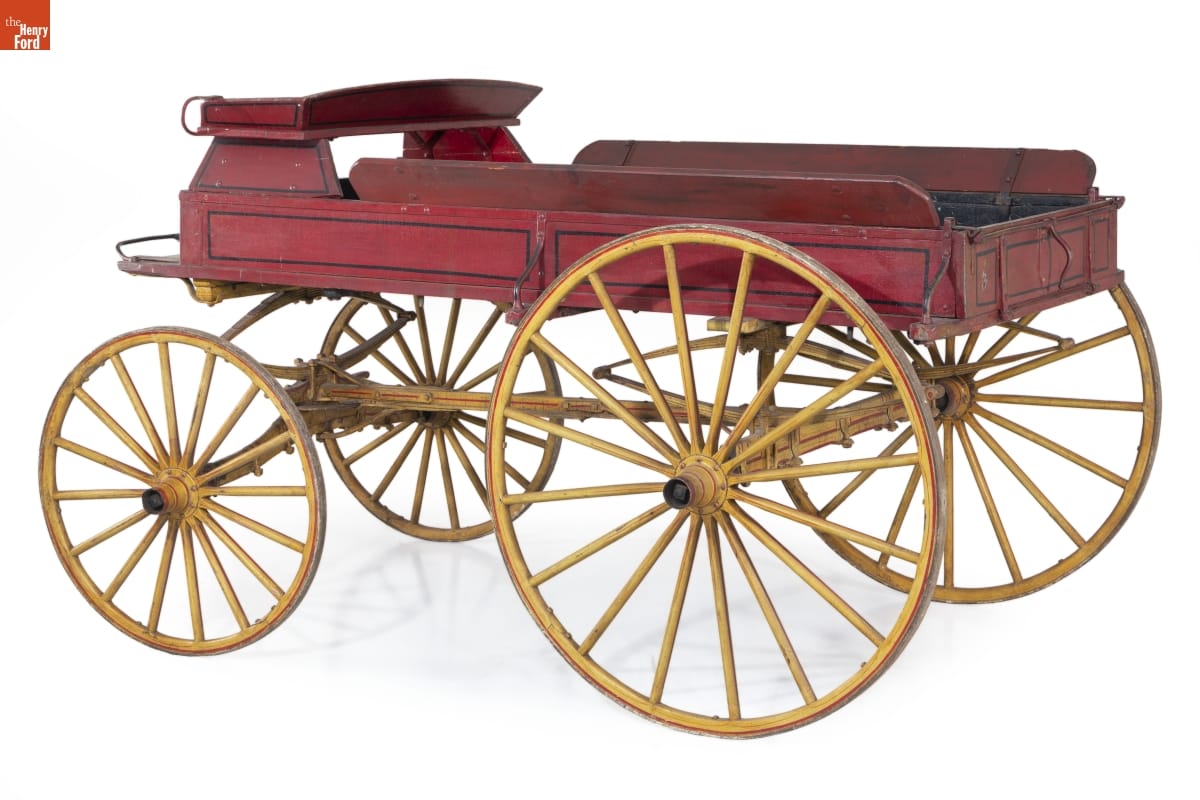 Delivery wagons were used by all types of businesses to transport goods from the vendor to the customer. Flare boards on top of this vehicle keep the cargo from spilling over the sides, and the end gate drops to ease loading and unloading. This wagon has an interesting device that allows the two gate catches to be released simultaneously.