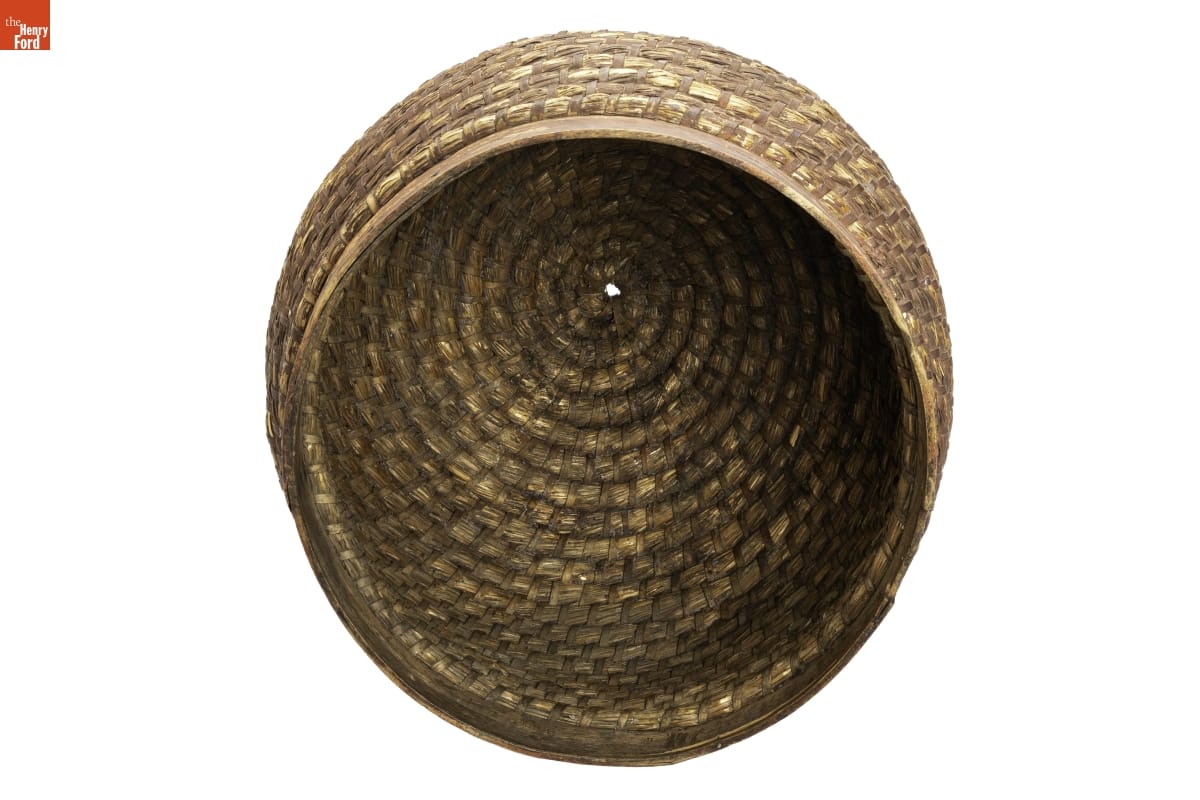A bee skep provided shelter to domesticated honeybees. A skep consisted of coiled grain straw bound with wood splints. The small opening allowed bees to enter and make their honeycomb to store food to sustain the hive's bee larvae. Beekeepers put skeps near orchards, gardens, and fields with plants needing pollination and harvested the excess honey and beeswax.