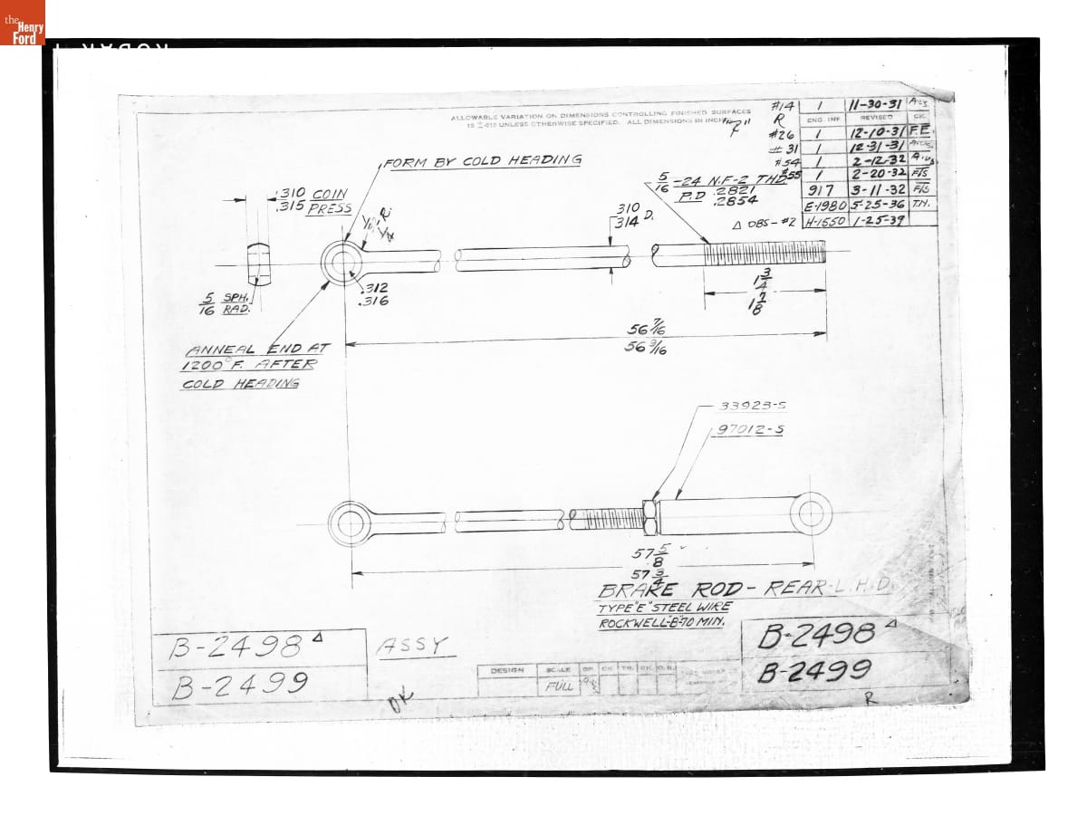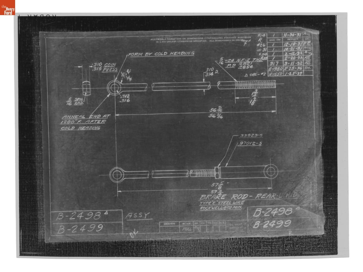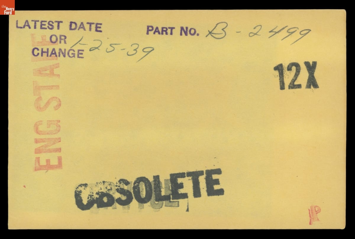 The Ford Motor Company created over a million parts drawings from 1903 to 1957. Many of these drawings specify engineering requirements for the components of Ford-made vehicles--including automobiles, trucks, tractors, military vehicles and Tri-motor airplanes. Others document assembly components, stages of casting and forging, or experimental designs. Beginning in the 1940s, Ford transferred the drawings to microfilm.