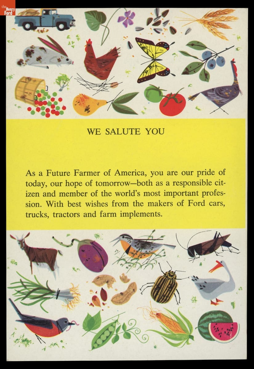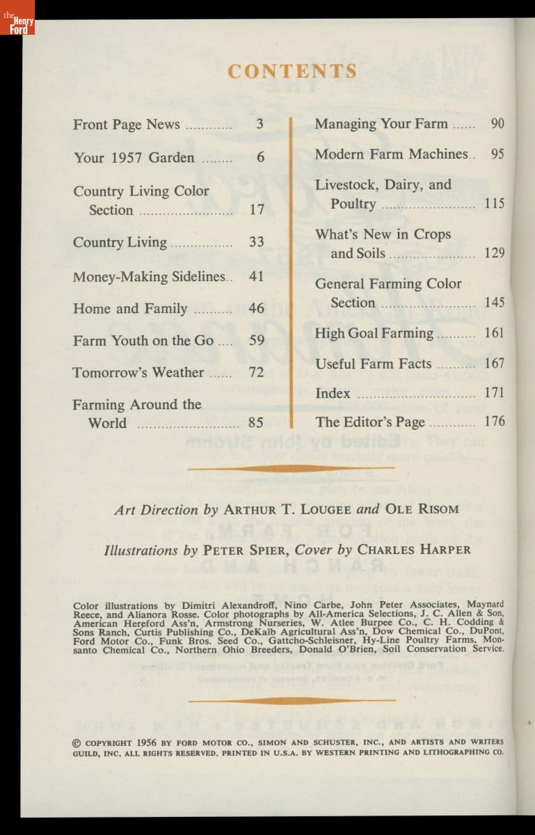 Ford Motor Company published a series of almanacs from the 1950s until at least 1980. Issues covered a range of topics and included weather predictions, gardening and "country living" tips, and suggestions for agricultural mechanization and efficiency. Text and images throughout advertised the ways Ford automobiles, tractors, and agricultural implements might increase farmers' profits and enhance rural customers' lives.