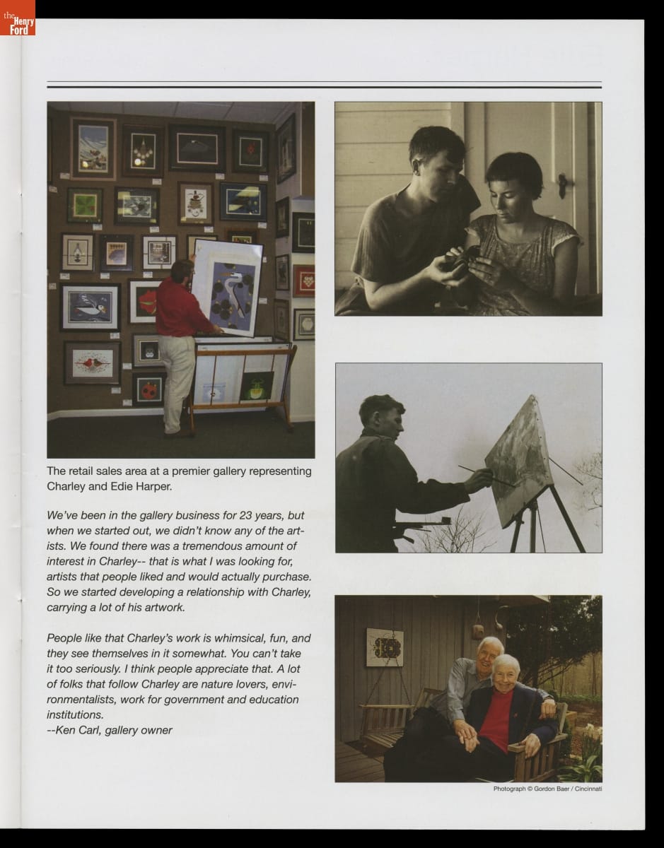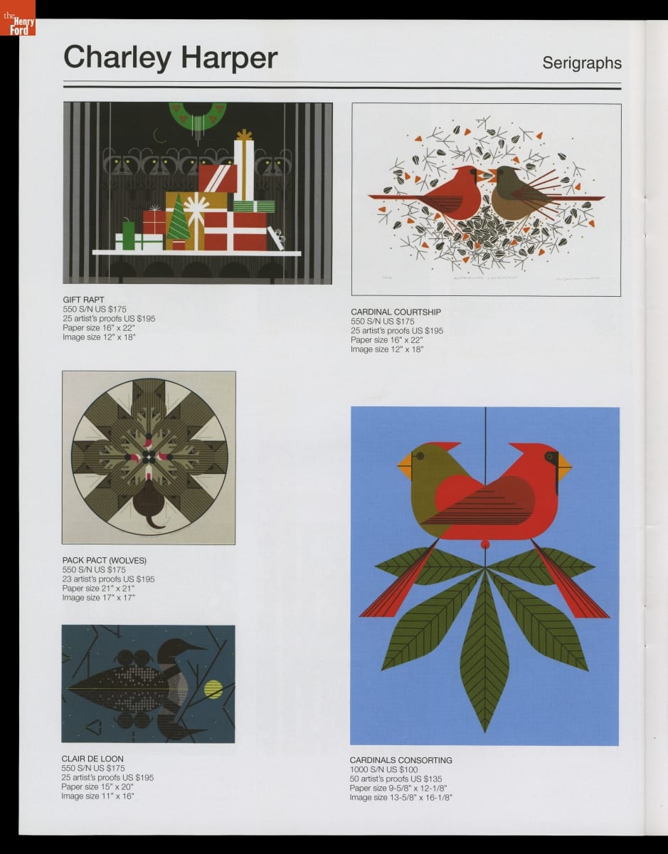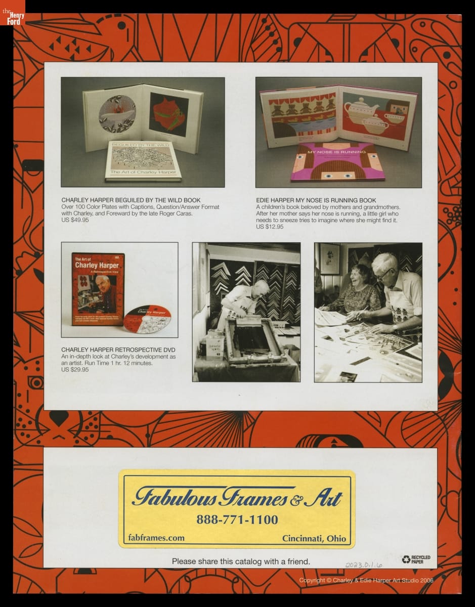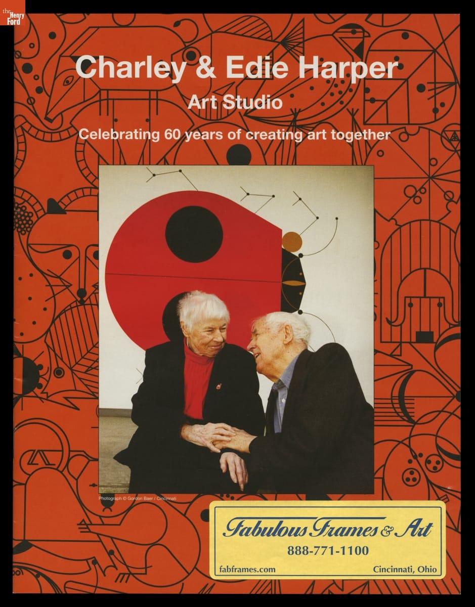 Charley Harper (1922-2007) and Edie McKee (1922-2010) met at the Art Academy of Cincinnati in 1940 and married in 1947. Both practiced art for the remainder of their lives, with Charley ultimately gaining fame for his unique style of illustrating wildlife. This trade catalog, published the year before Charley passed away, celebrated the Harpers' 60-year marriage and noteworthy careers.