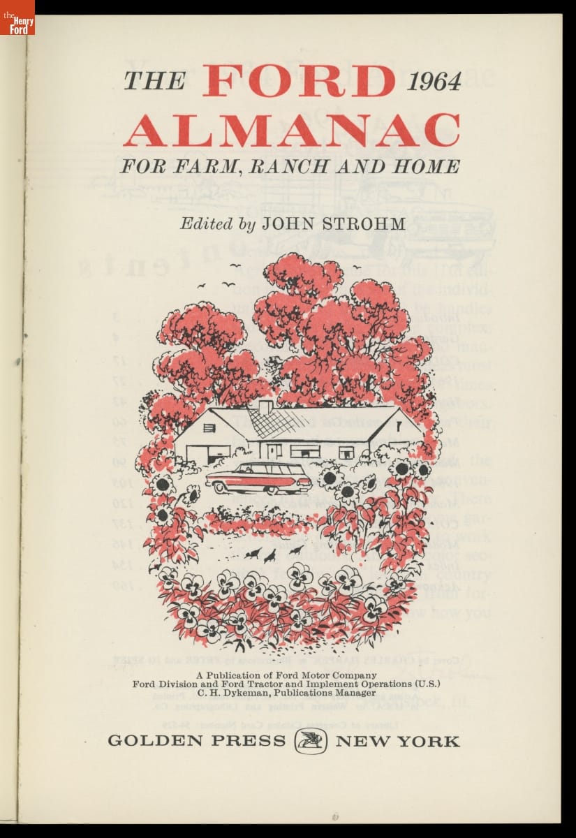 Ford Motor Company published a series of almanacs from the 1950s until at least 1980. Issues covered a range of topics and included weather predictions, gardening and "country living" tips, and suggestions for agricultural mechanization and efficiency. Text and images throughout advertised the ways Ford automobiles, tractors, and agricultural implements might increase farmers' profits and enhance rural customers' lives.