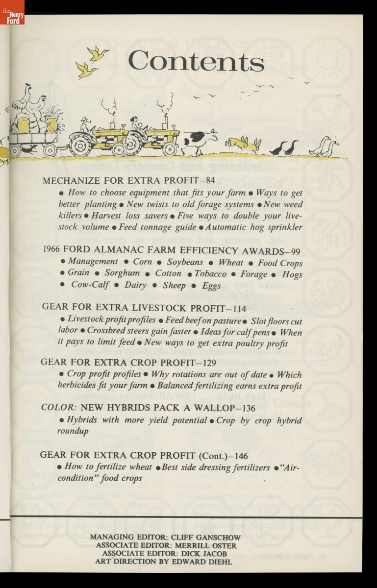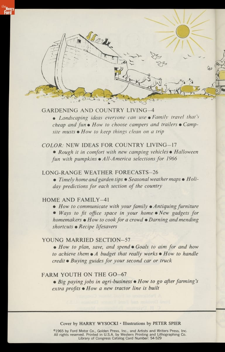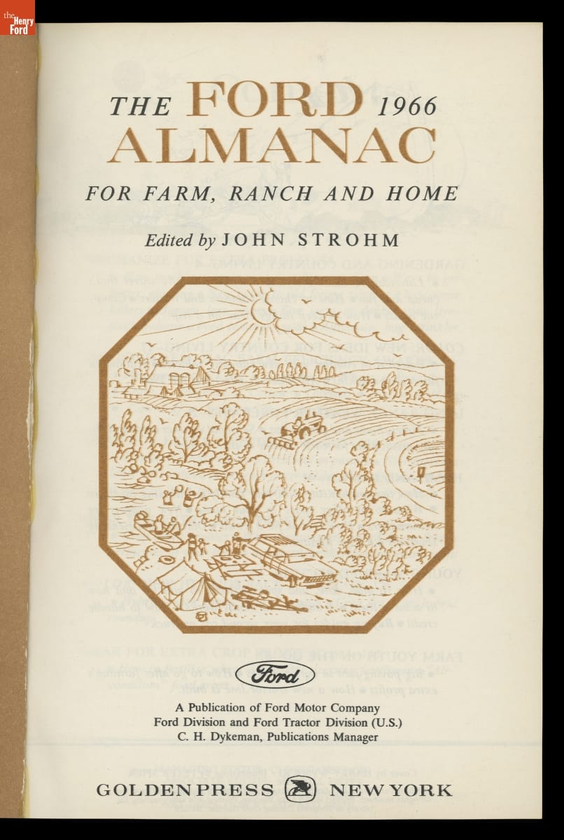 Ford Motor Company published a series of almanacs from the 1950s until at least 1980. Issues covered a range of topics and included weather predictions, gardening and "country living" tips, and suggestions for agricultural mechanization and efficiency. Text and images throughout advertised the ways Ford automobiles, tractors, and agricultural implements might increase farmers' profits and enhance rural customers' lives.