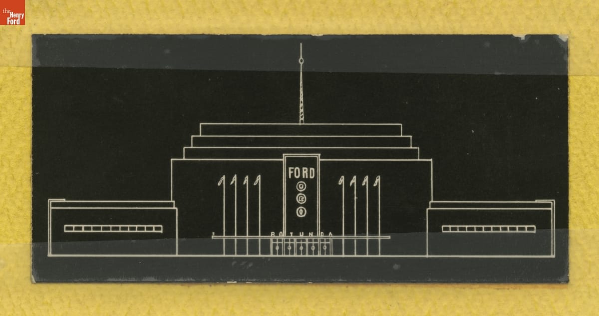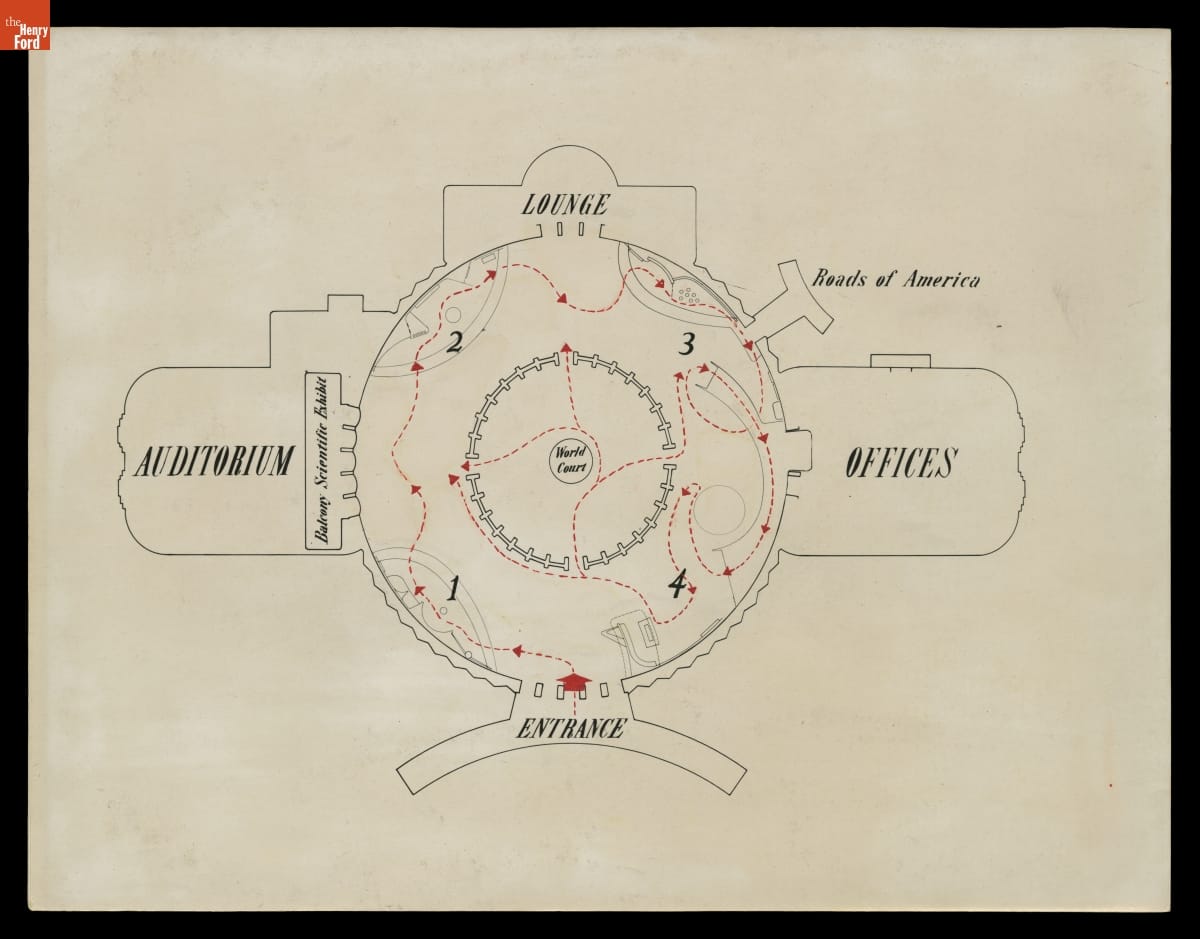 As part of its fiftieth anniversary celebration in 1953, Ford Motor Company refurbished the Rotunda -- an exhibit area and hospitality center for Ford's Rouge factory tours. In addition to several dedicated exhibition spaces, the new design included an auditorium, a public lounge, and a themed outdoor ride. The Rotunda drew two million visitors annually until it was destroyed by fire in 1962.