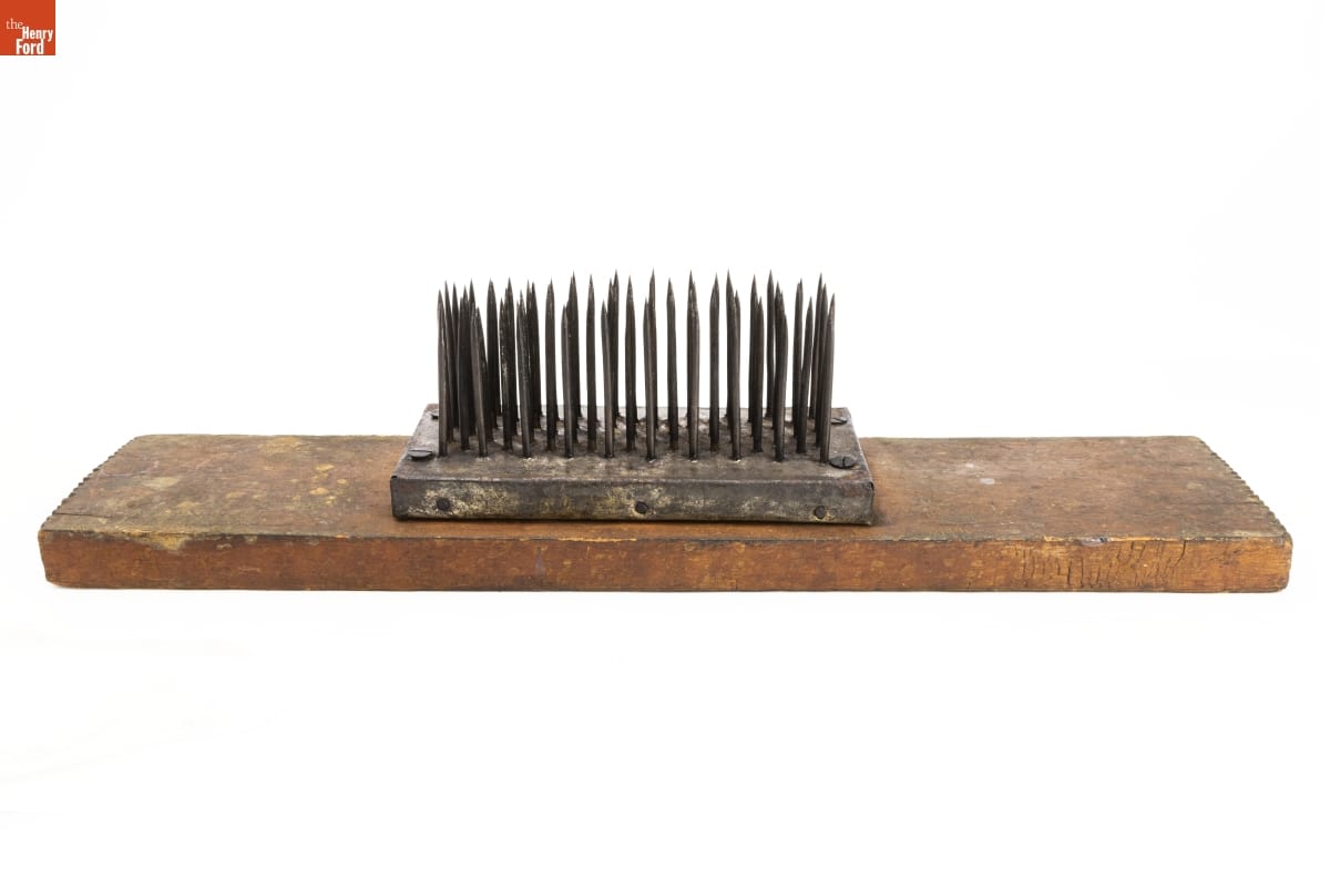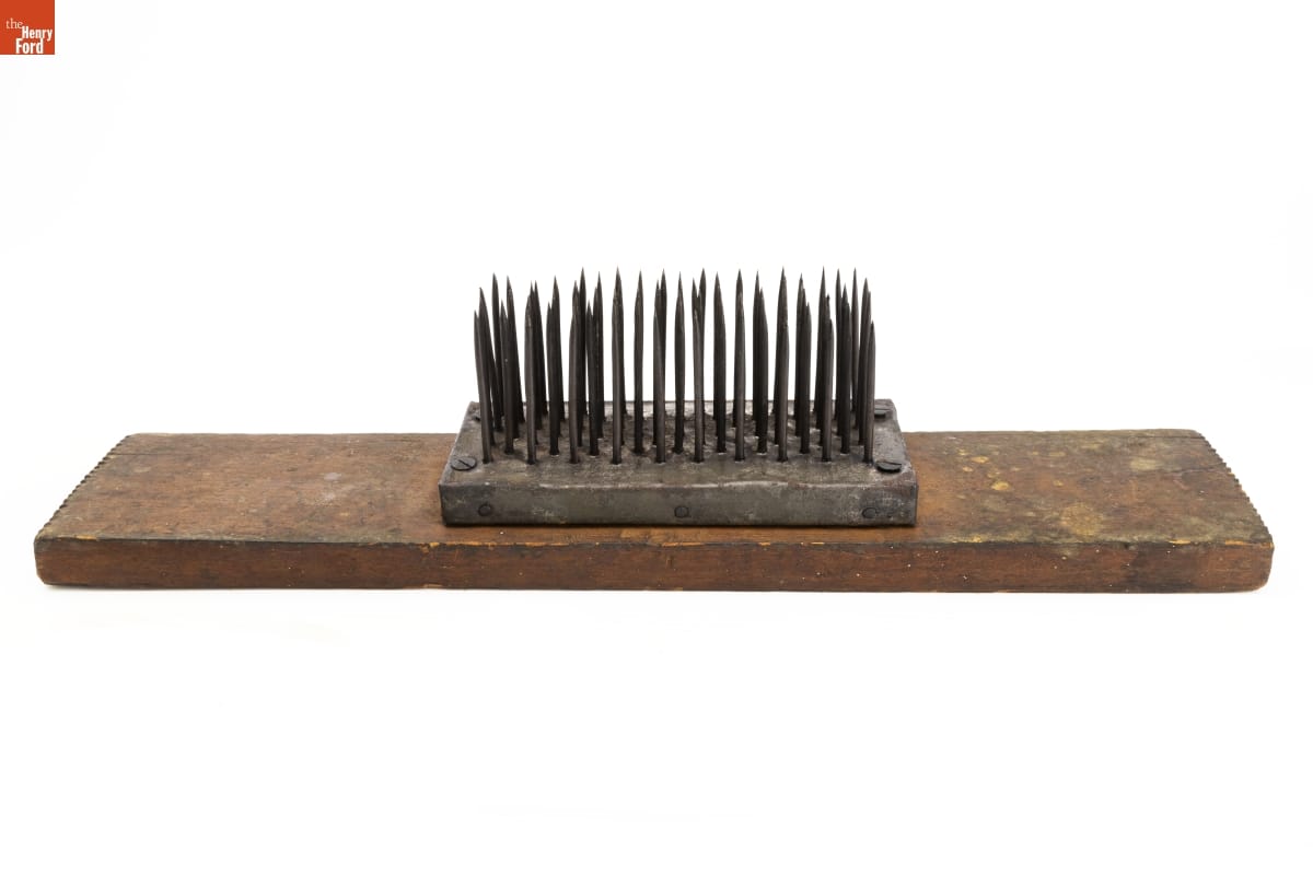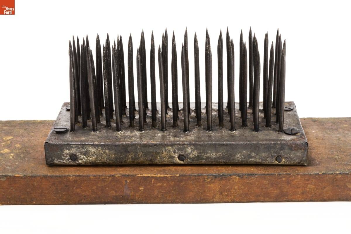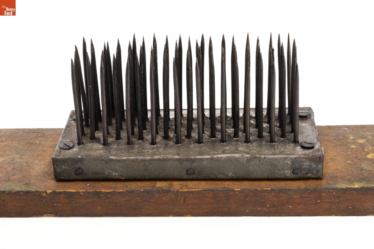 Producing linen yarn by hand from the flax plant is labor-intensive and time-consuming. The useable fibers of the plant are encased in a hard outer coating in the stem. After this coating is removed, the fibers are drawn through a series of hackles--boards with sharp metal spikes--to align the long fibers and remove debris and short fibers.