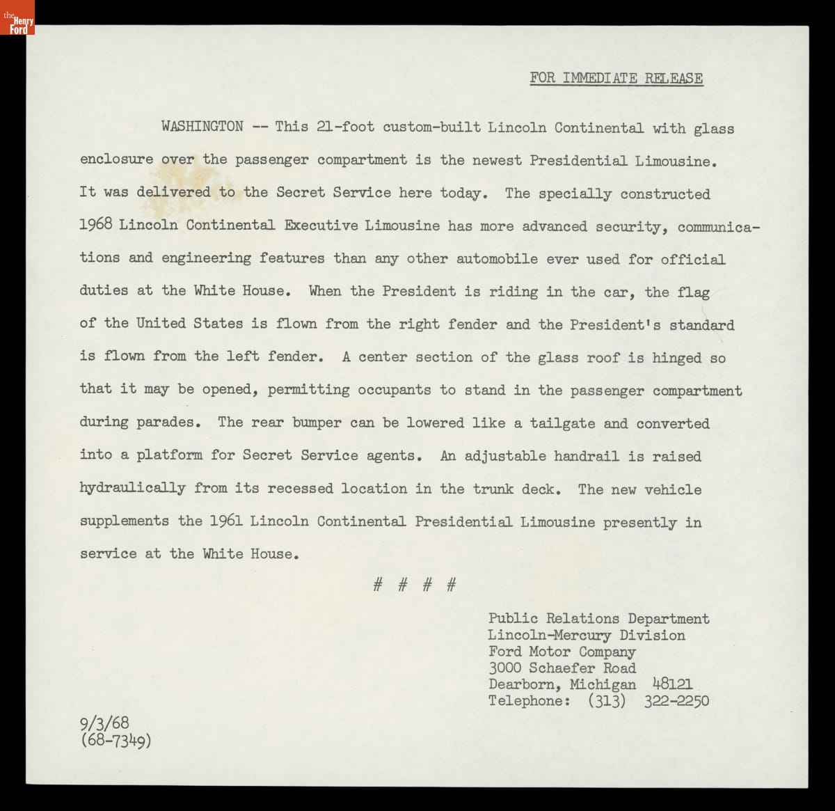 1969 Lincoln Continental Presidential Limousine, September 1968