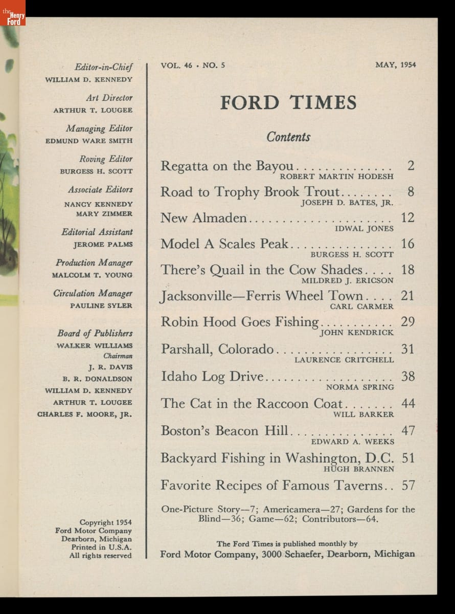 Ford Motor Company published Ford Times magazine from 1908 to 1917 and again from 1943 to 1993. Intended for dealers and consumers, the publication was key to Ford's public relations efforts. With articles emphasizing a range of topics, including automobiles but also recreation, food, history, nature, and culture, Ford Times became an important document of 20th-century American life.