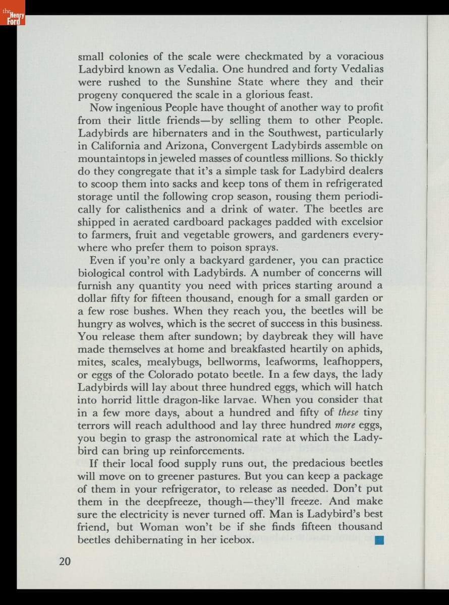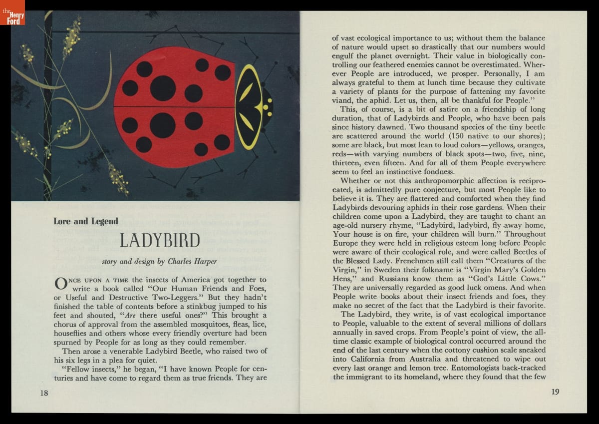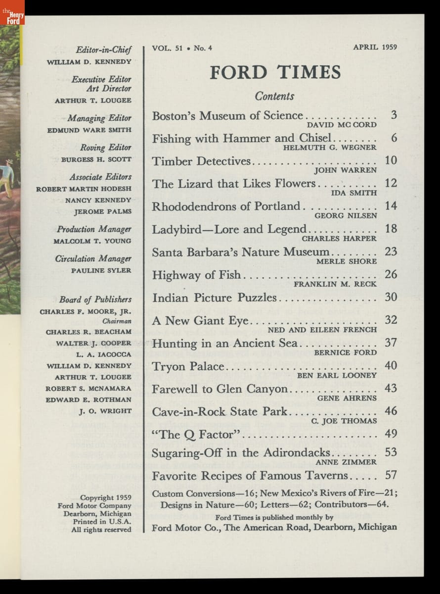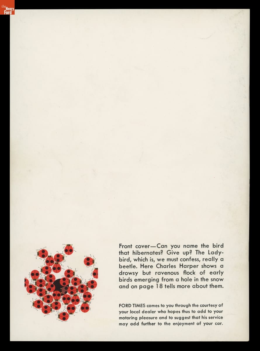 Ford Times magazine was a key element of Ford Motor Company's public relations efforts for much of the 20th century. Issues covered a wide range of topics, including automobiles but also recreation, food, history, nature, and culture. Between 1948 and 1982, Cincinnati artist Charley Harper contributed cover and article illustrations to more than 160 issues. This issue features one of Harper's thirty-six Ford Times covers.