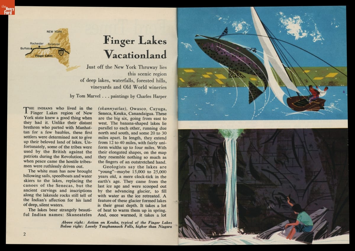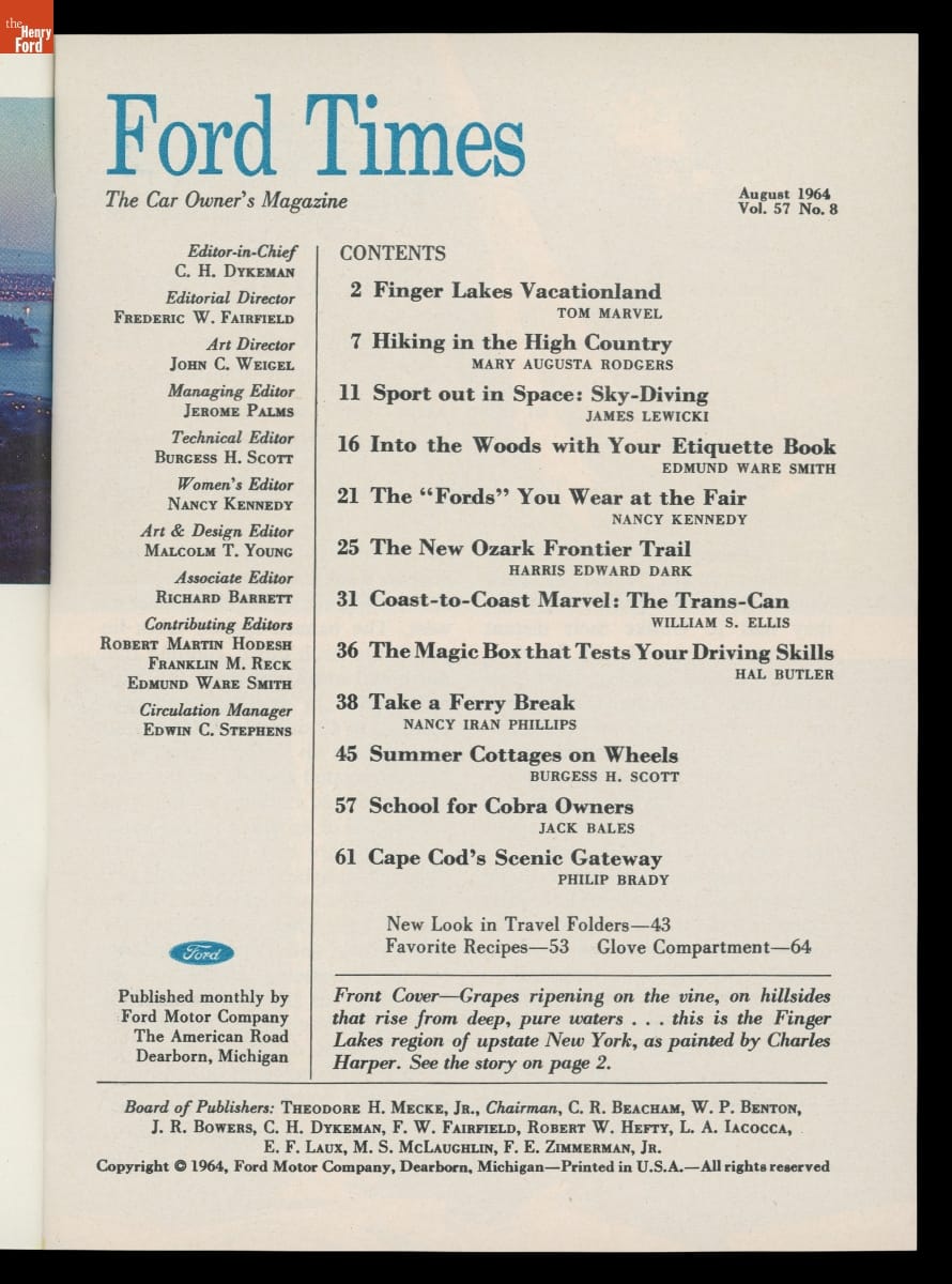 Ford Times magazine was a key element of Ford Motor Company's public relations efforts for much of the 20th century. Issues covered a wide range of topics, including automobiles but also recreation, food, history, nature, and culture. Between 1948 and 1982, Cincinnati artist Charley Harper contributed cover and article illustrations to more than 160 issues. This issue features one of Harper's thirty-six Ford Times covers.