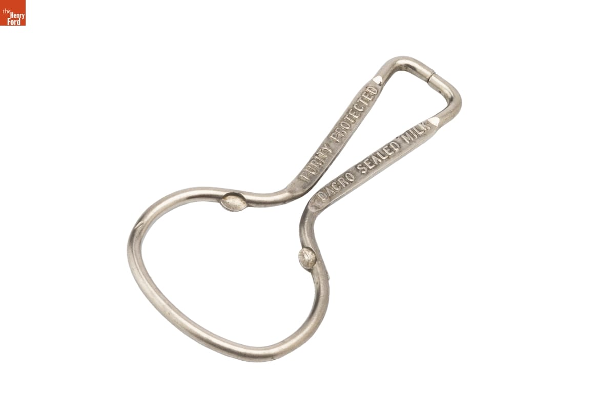 Dairies have supplied fresh milk products to consumers in glass bottles since the late 1800s. Dairies sealed the bottles with glass, metal, or cardboard caps for spill-free deliveries. Turner & Wescott, a Pennsylvania dairy operating into the late 1900s, shipped its products in wide-mouthed bottles with a metal cap. Customers needed an opener like this to pry off the cap.