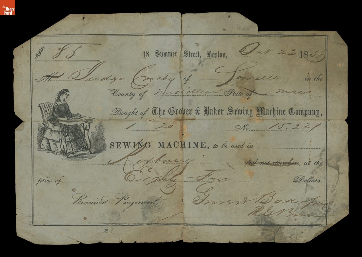 Receipt for Grover & Baker Portable Sewing Machine Purchased by Judge Nathan Crosby, October 22, 1858