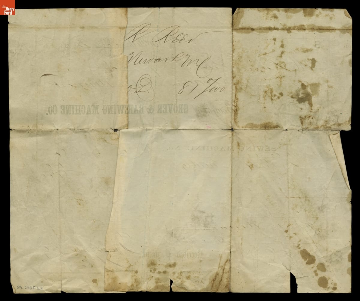 Receipt for Grover & Baker Portable Sewing Machine and Needles Purchased by Rufus Reed, June 12, 1857