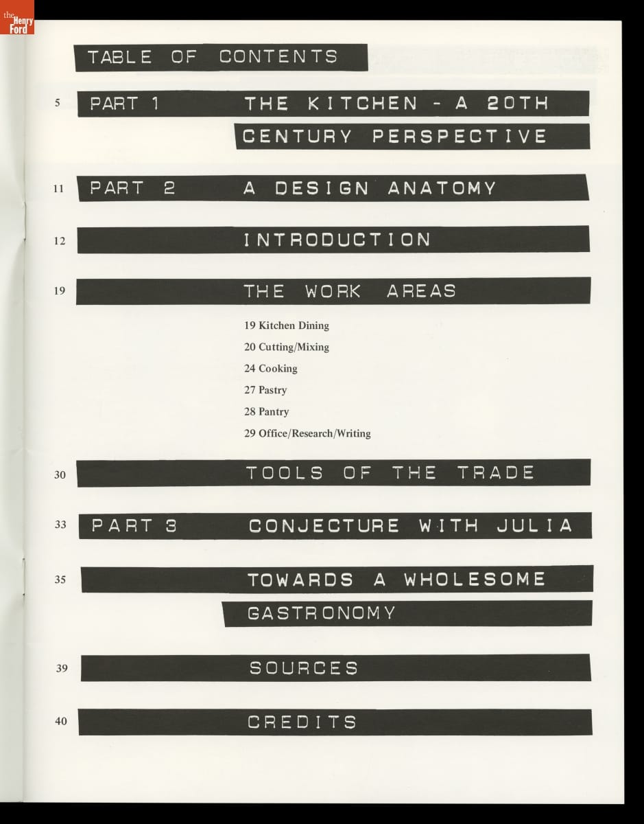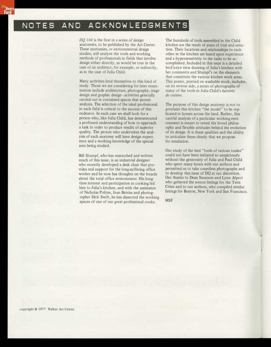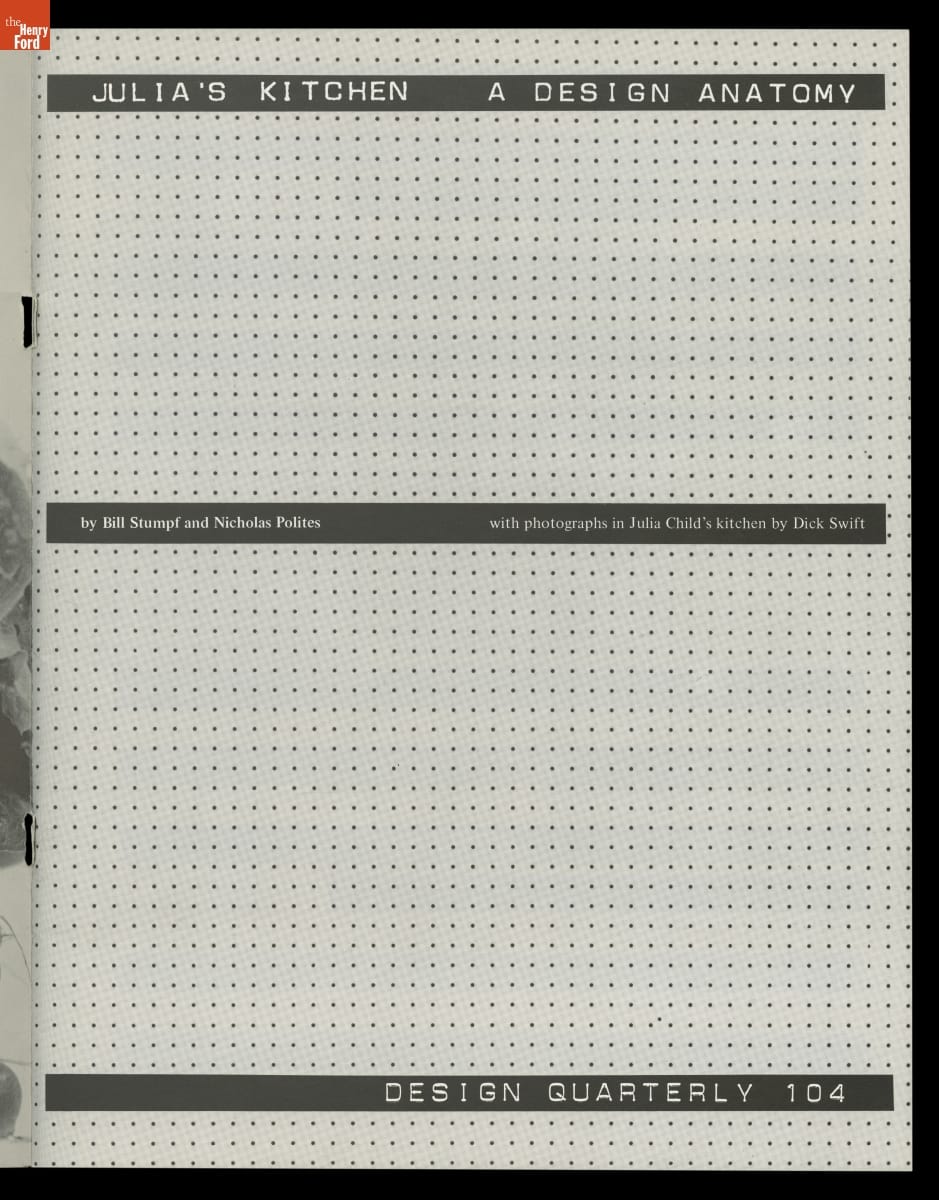 In 1977, "Julia's Kitchen: A Design Anatomy" was published as the first in a series of "design anatomies" by Design Quarterly. In this issue, designer Bill Stumpf and his team examined how Julia Child -- a chef well-versed in the functions of a kitchen -- designed her own kitchen. Numerous sketches and photographs, as well as hours of interviews with Paul and Julia Child, informed the issue.