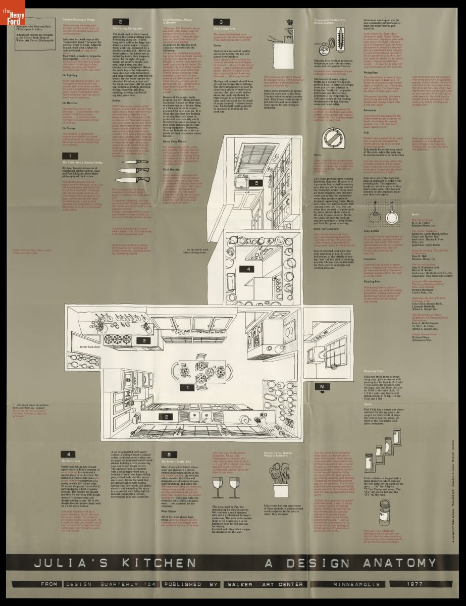 In 1977, "Julia's Kitchen: A Design Anatomy" was published as the first in a series of "design anatomies" by Design Quarterly. In this issue, designer Bill Stumpf and his team examined how Julia Child -- a chef well-versed in the functions of a kitchen -- designed her own kitchen. Numerous sketches and photographs, as well as hours of interviews with Paul and Julia Child, informed the issue.