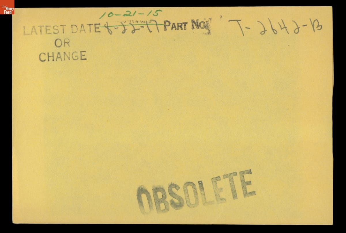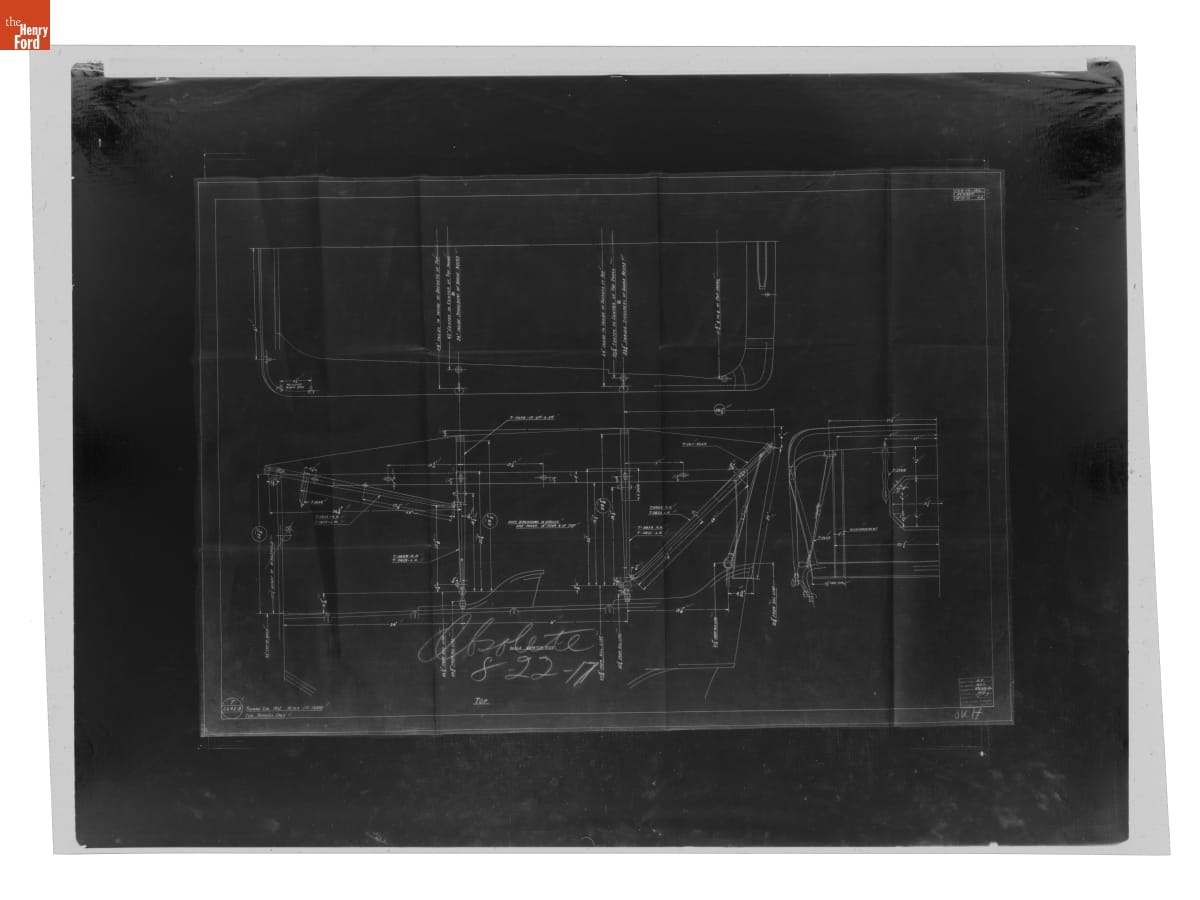 The Ford Motor Company created over a million parts drawings from 1903 to 1957. Many of these drawings specify engineering requirements for the components of Ford-made vehicles--including automobiles, trucks, tractors, military vehicles and Tri-motor airplanes. Others document assembly components, stages of casting and forging, or experimental designs. Beginning in the 1940s, Ford transferred the drawings to microfilm.