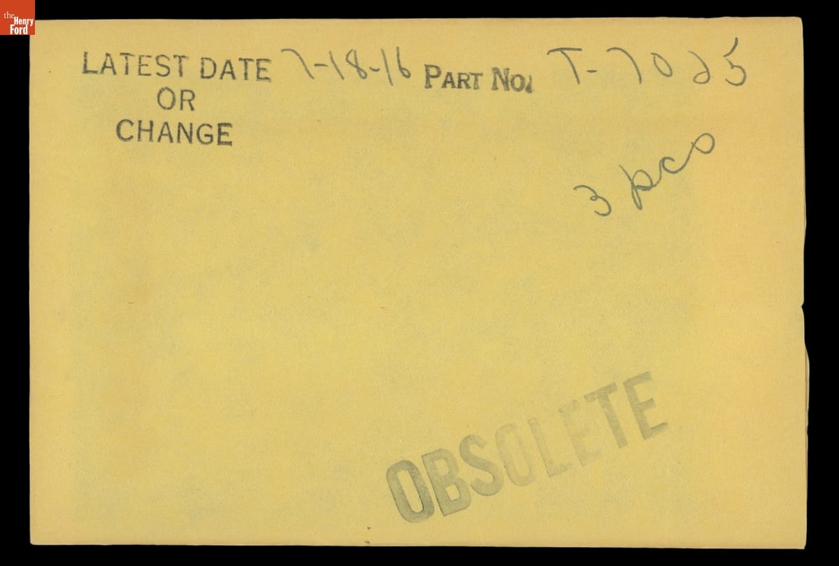 The Ford Motor Company created over a million parts drawings from 1903 to 1957. Many of these drawings specify engineering requirements for the components of Ford-made vehicles--including automobiles, trucks, tractors, military vehicles and Tri-motor airplanes. Others document assembly components, stages of casting and forging, or experimental designs. Beginning in the 1940s, Ford transferred the drawings to microfilm.