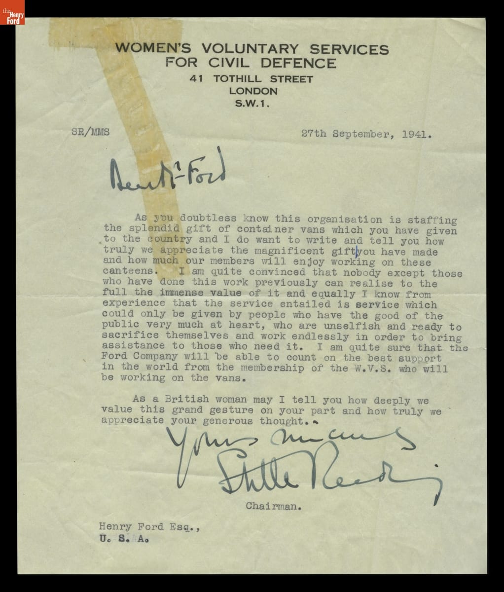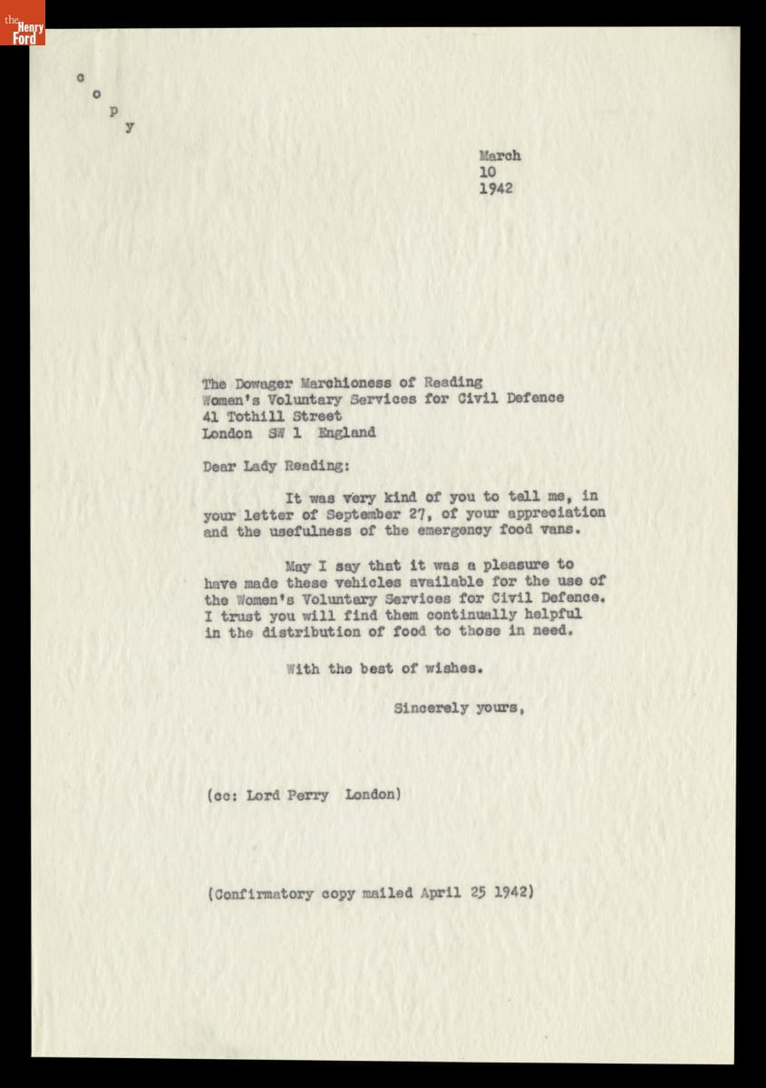 Correspondence regarding Ford Motor Company's Donation of Emergency Food Vans to Great Britain, 1941-1942