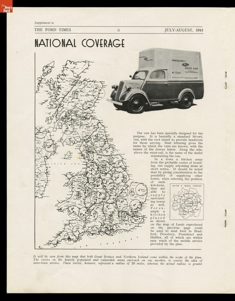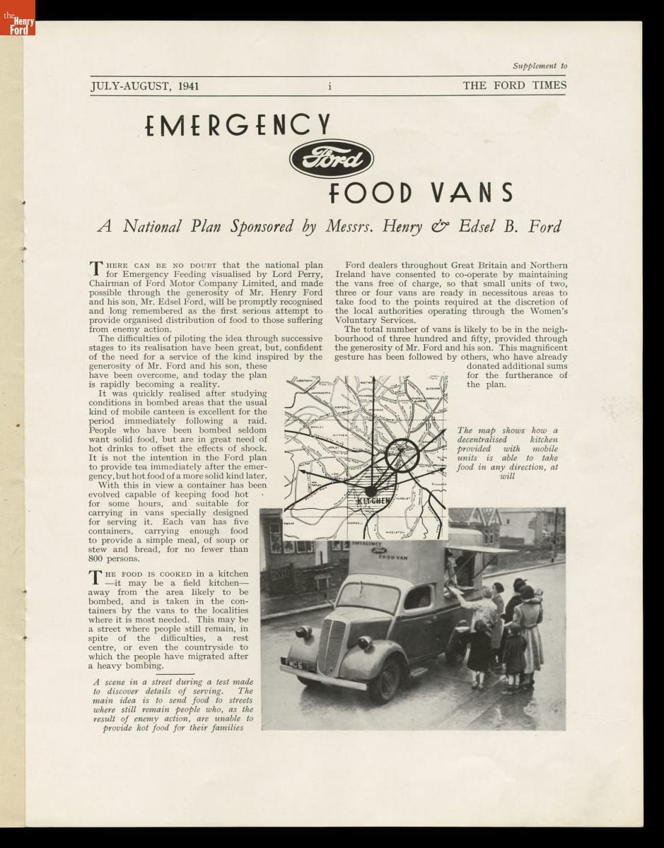During World War II, Ford Motor Company and many of its global subsidiaries and dealers donated hundreds of emergency food vans to Great Britain. Following aerial bombings in Germany's Blitz campaign, these vans traveled to attacked areas and offered survivors the comforts of a cup of tea and a hot meal. The vans provided food for schoolchildren as well.