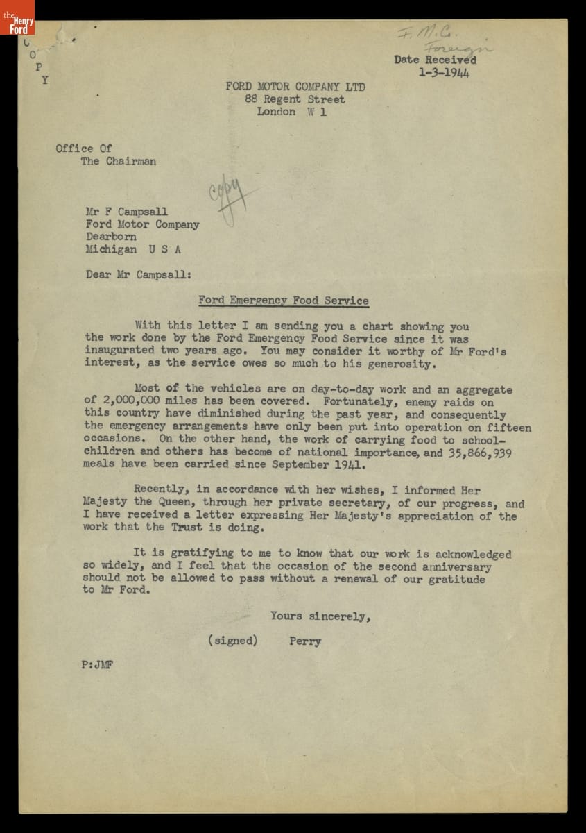 Letter and Chart Showing Ford Emergency Food Van Use in England from 1942-1944