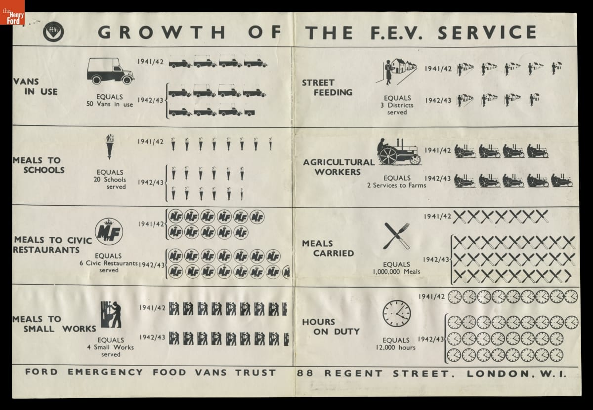 During World War II, Ford Motor Company and many of its global subsidiaries and dealers donated hundreds of emergency food vans to Great Britain. Following aerial bombings in Germany's Blitz campaign, these vans traveled to attacked areas and offered survivors the comforts of a cup of tea and a hot meal. The vans provided food for schoolchildren as well.