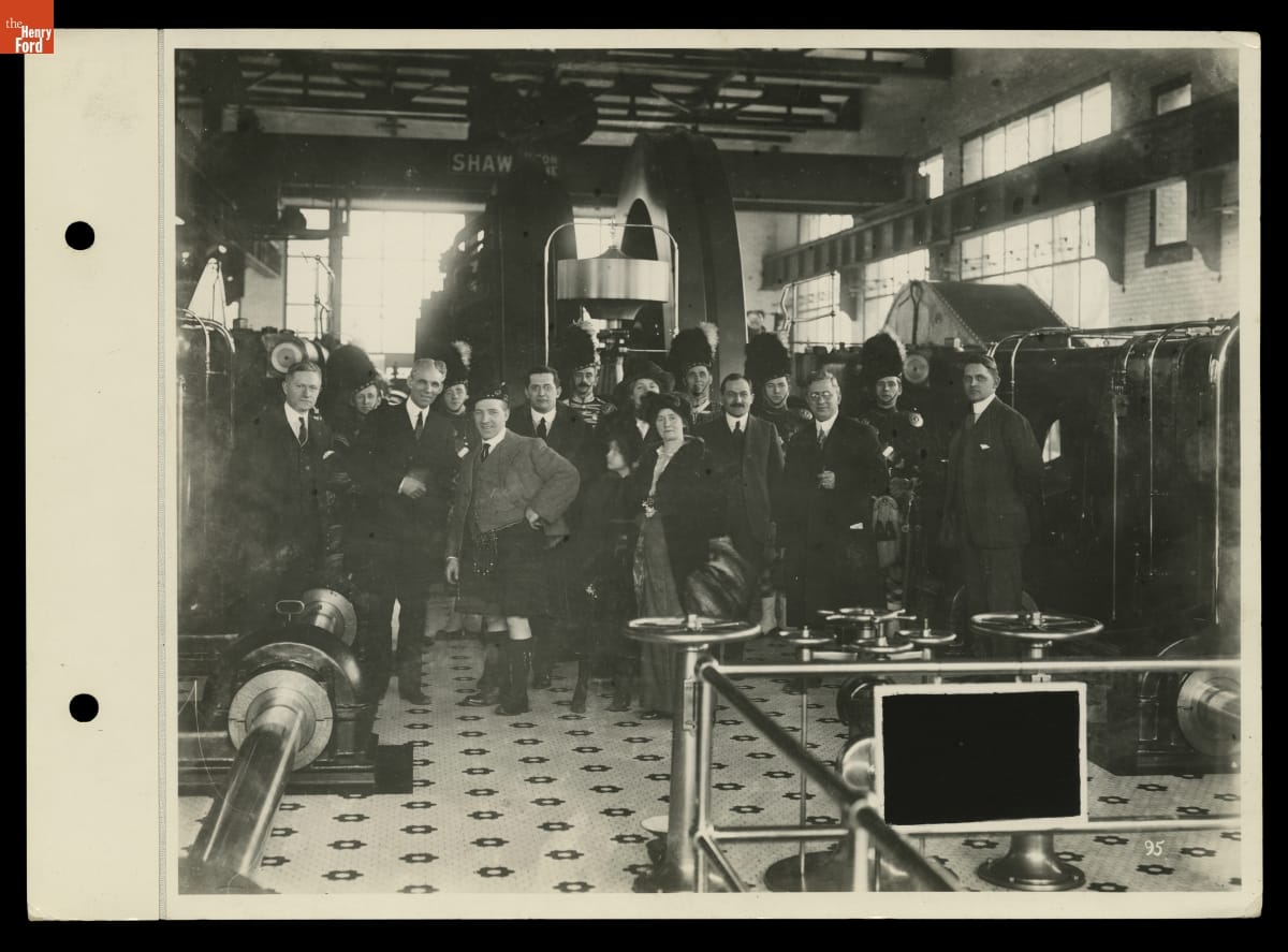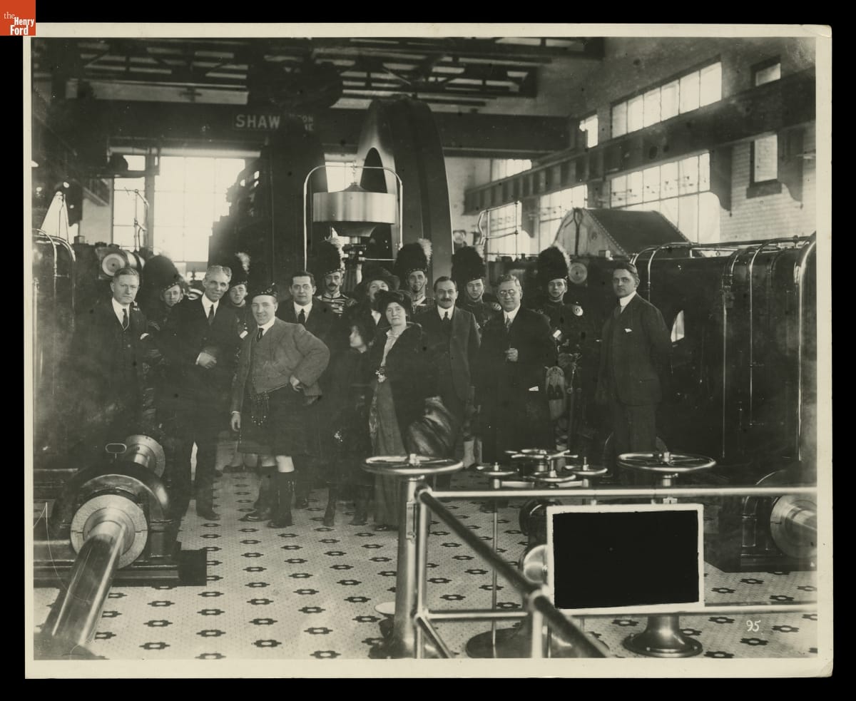 Henry Ford, Charles Sorensen, and Sir Harry Lauder with Bagpipers in the Highland Park Plant Powerhouse, 1914