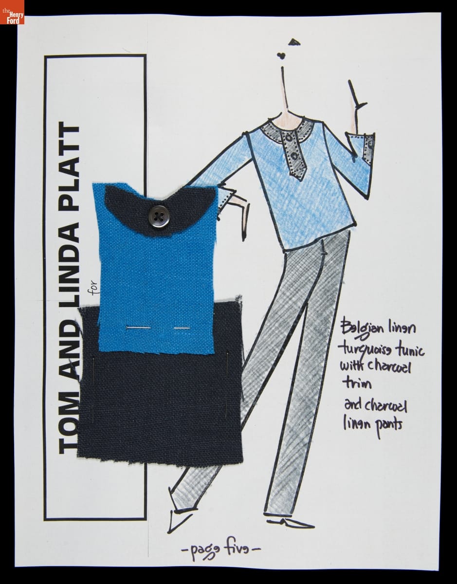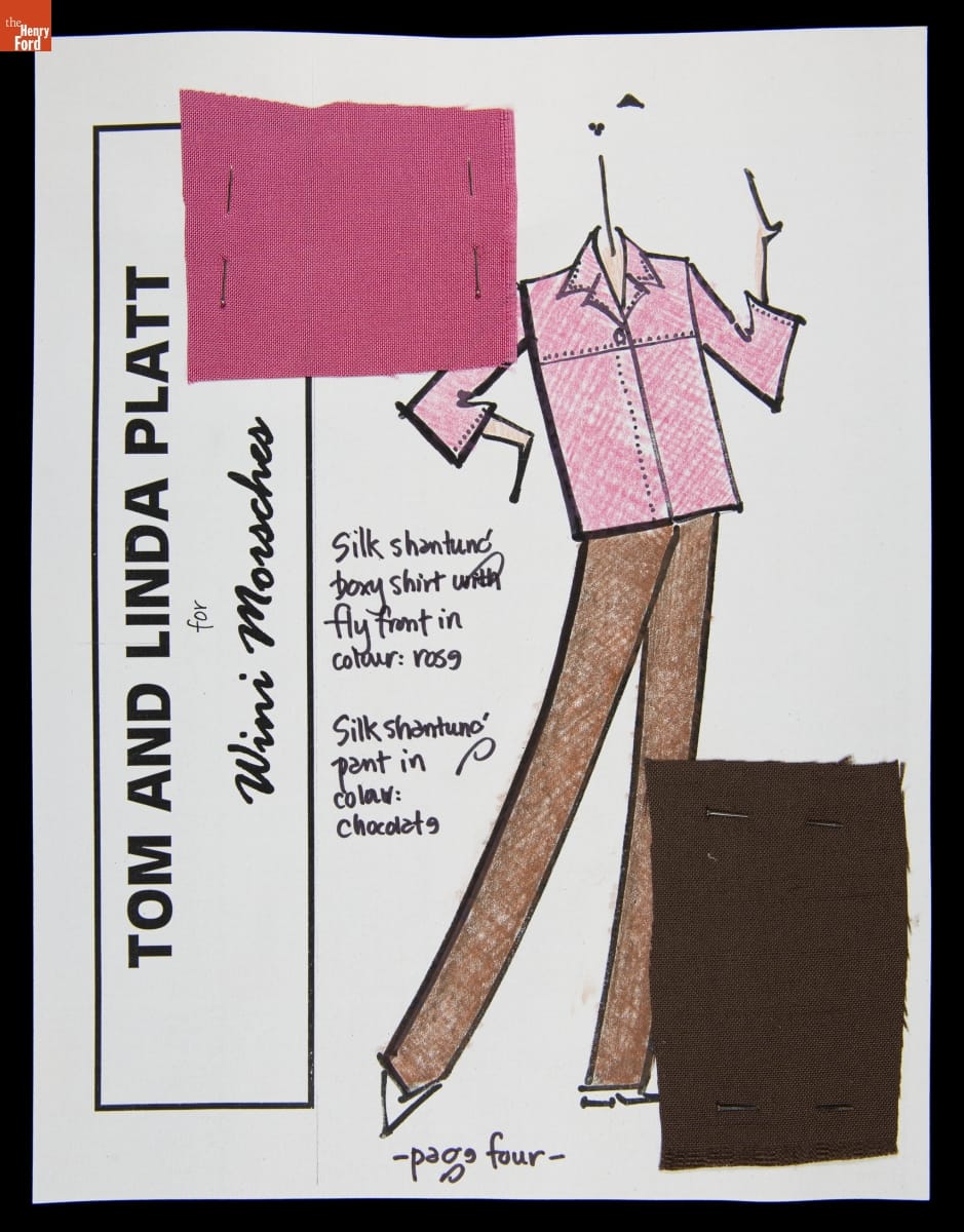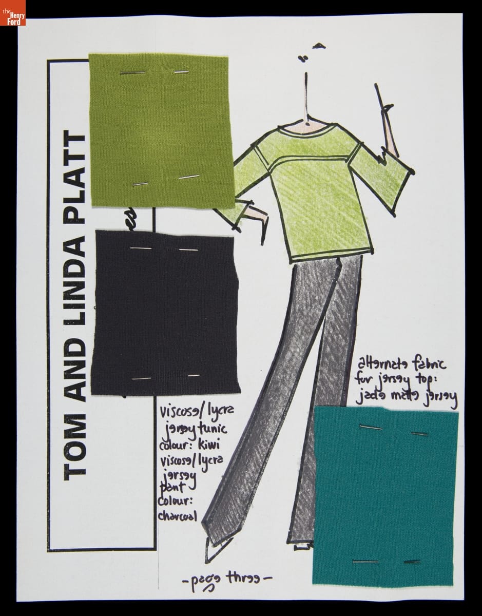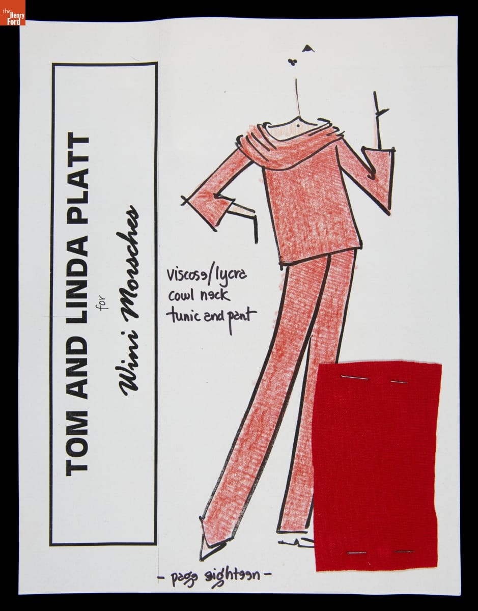 New York designers Tom and Linda Platt believe great clothes should be simple. The couple's timeless designs -- with streamlined silhouettes, bold details, and daring colors -- transcend trends and fashion obsolescence, and are at home in small-town America or cosmopolitan city. This album contains Platt sketches and fabric samples for their client Winifred Jones Morsches, a wealthy woman from a small Indiana town.
