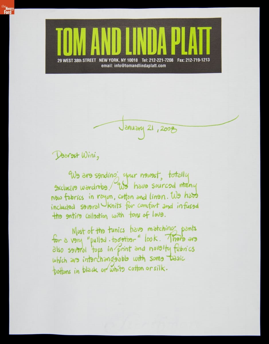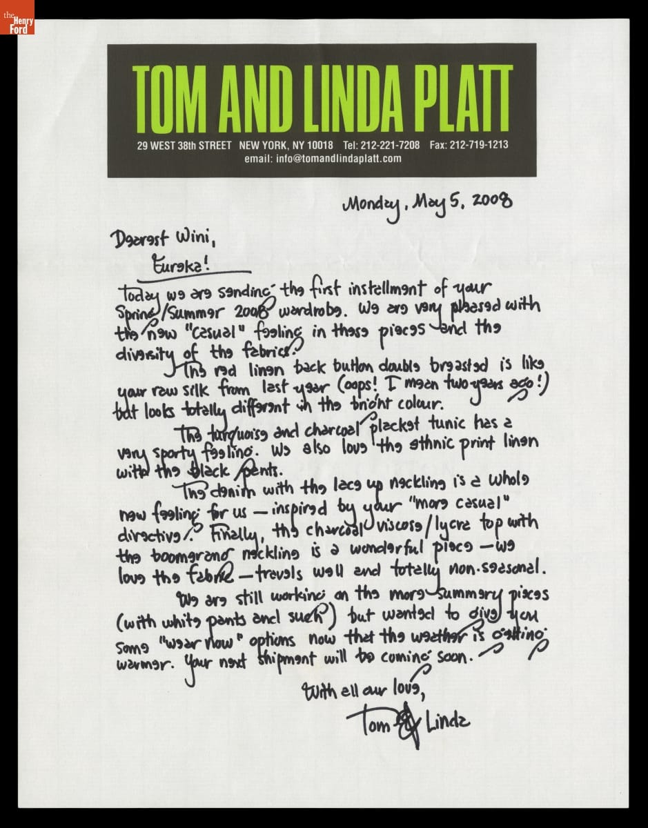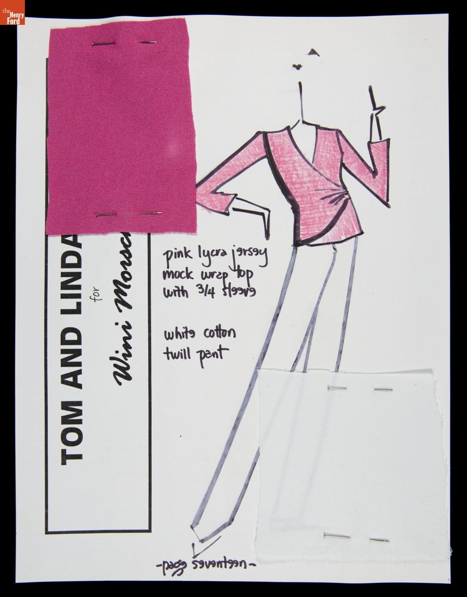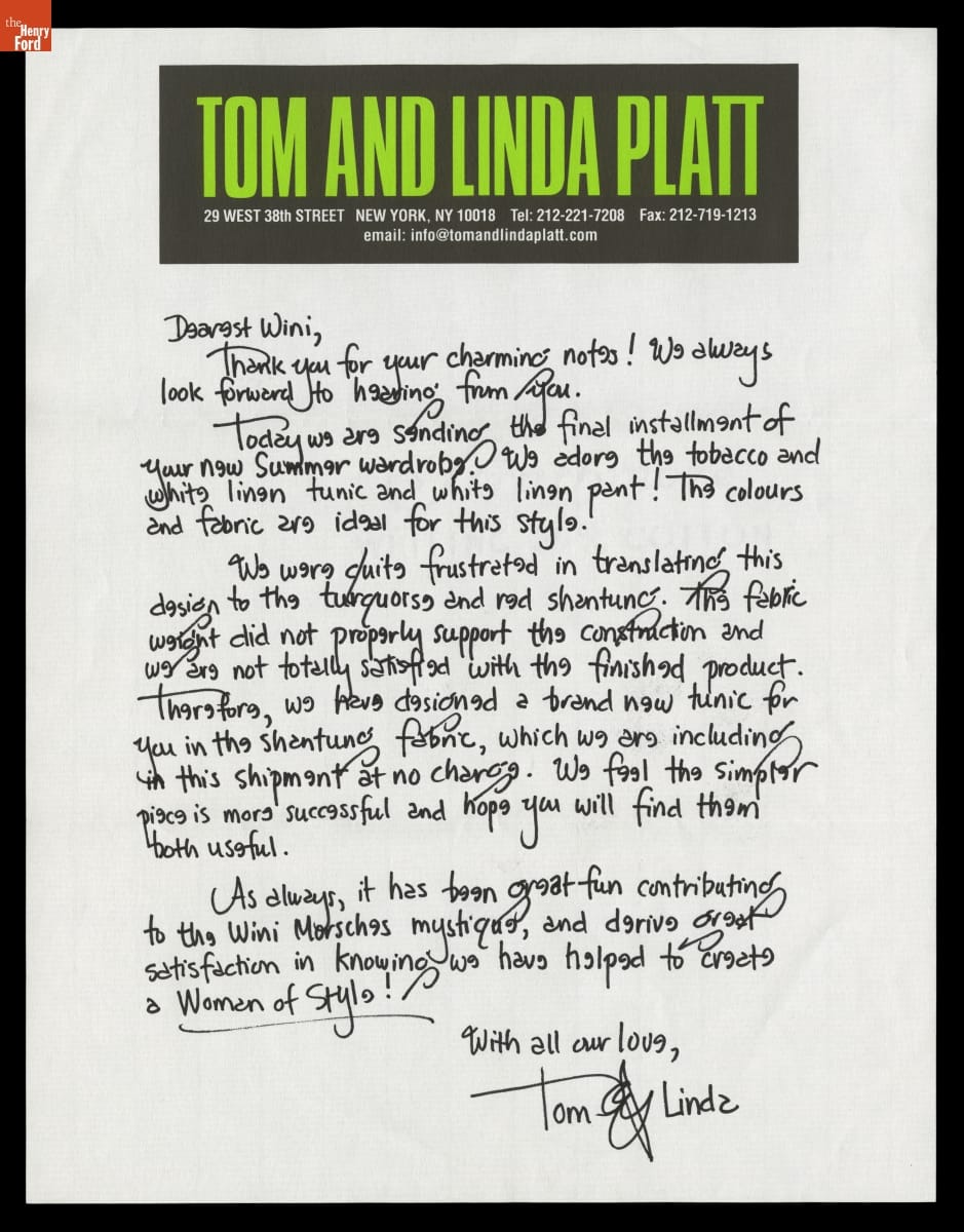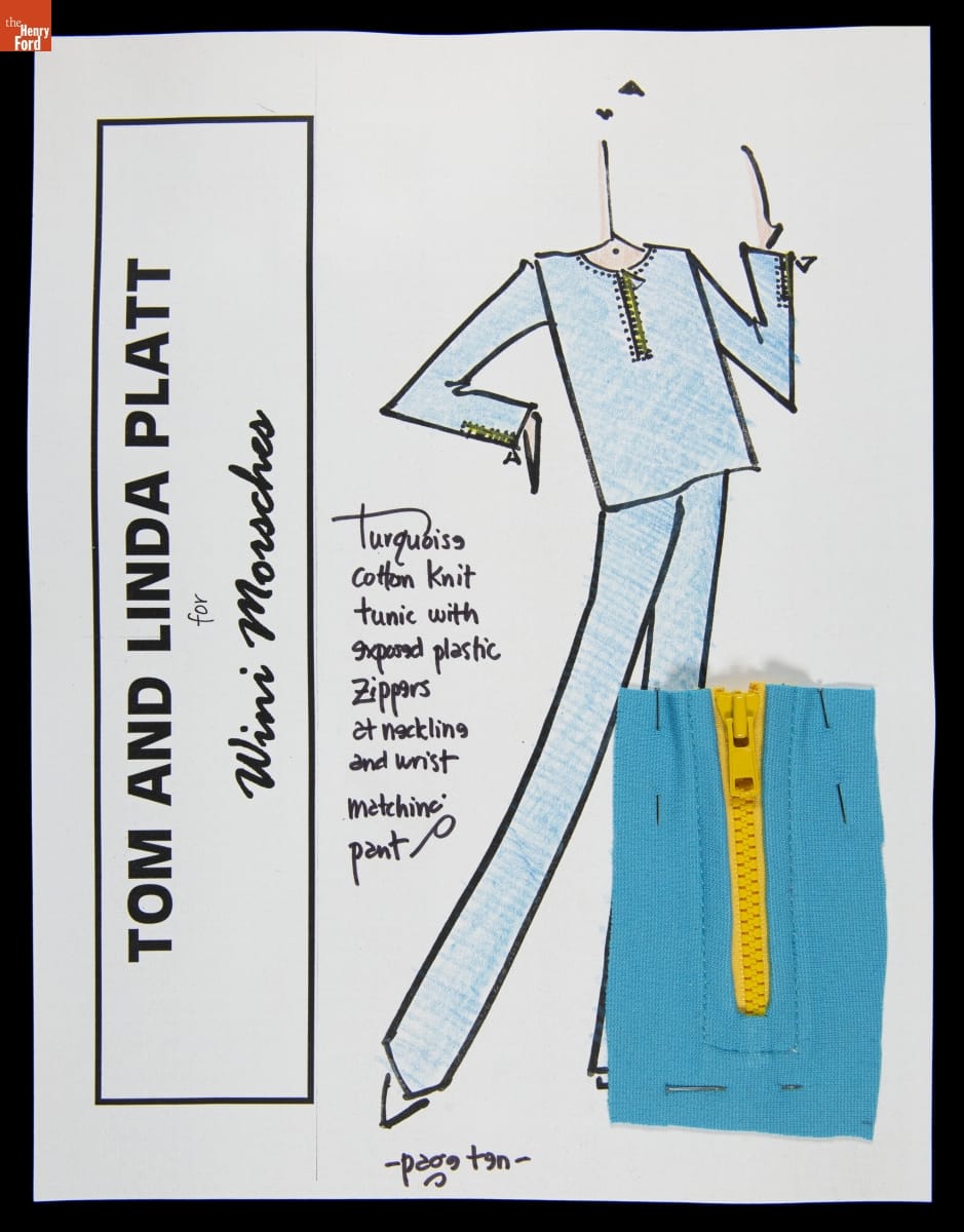 New York designers Tom and Linda Platt believe great clothes should be simple. The couple's timeless designs -- with streamlined silhouettes, bold details, and daring colors -- transcend trends and fashion obsolescence, and are at home in small-town America or cosmopolitan city. This album contains Platt sketches and fabric samples for their client Winifred Jones Morsches, a wealthy woman from a small Indiana town.