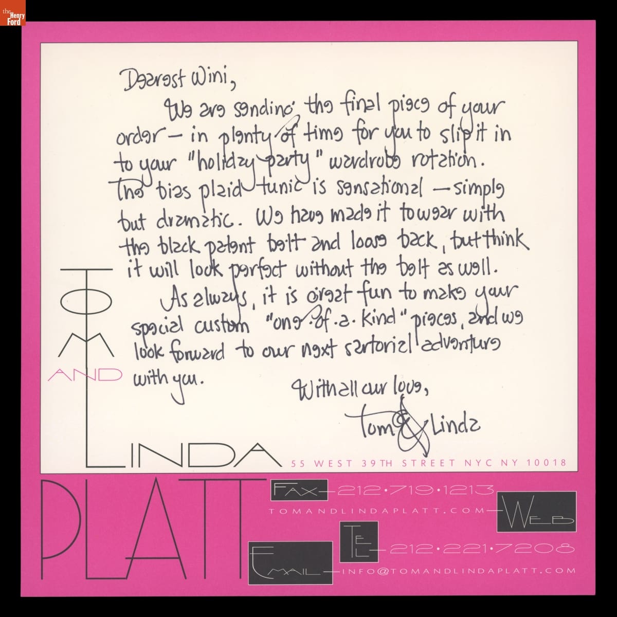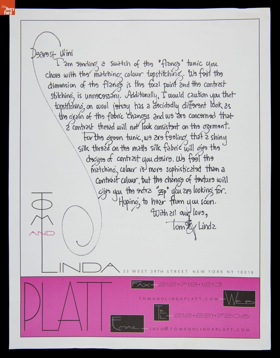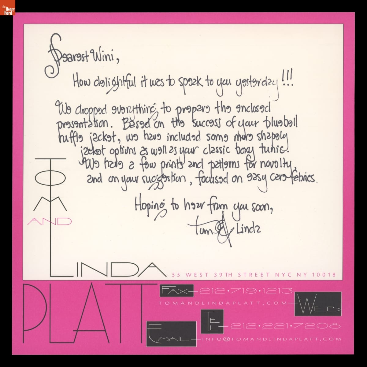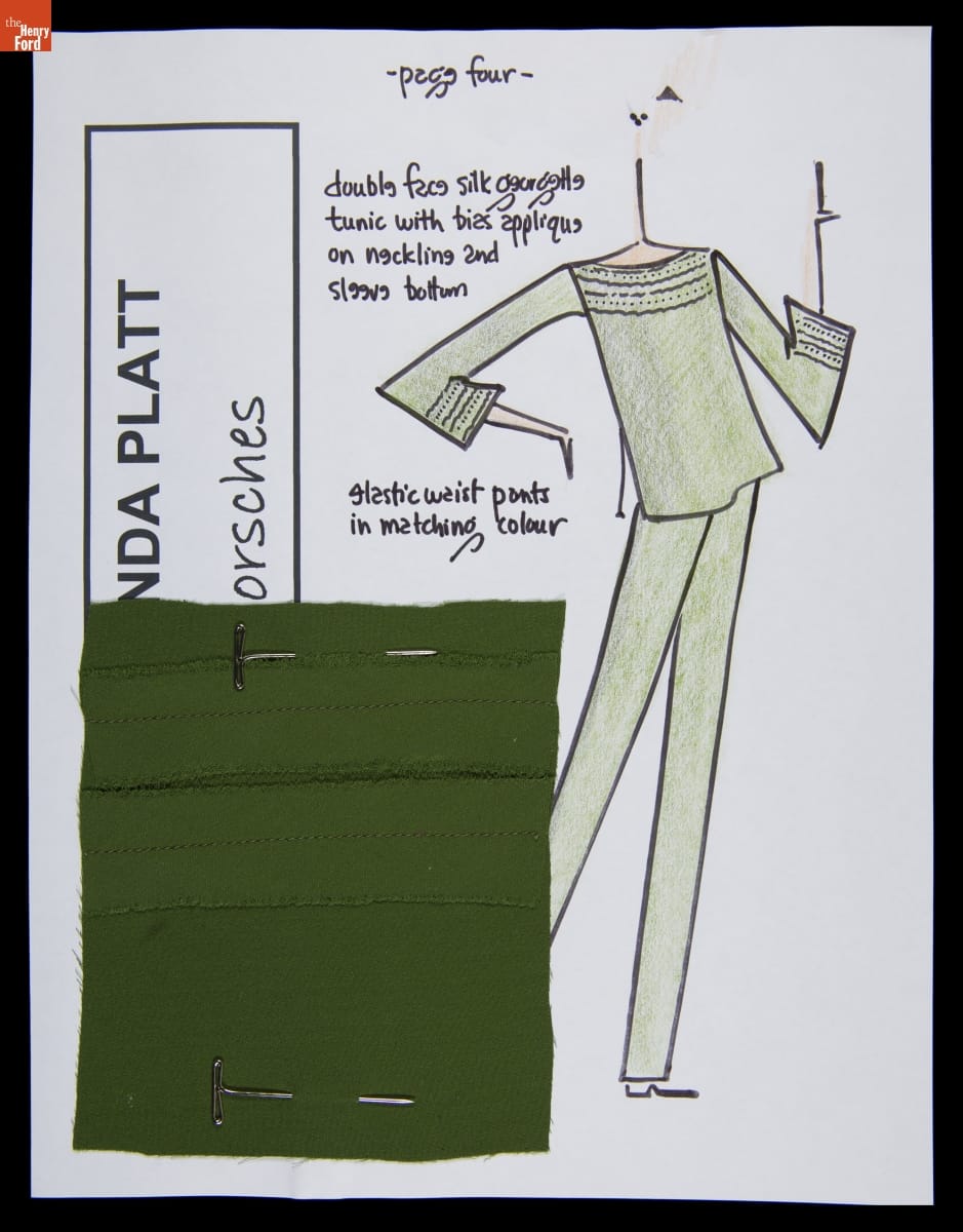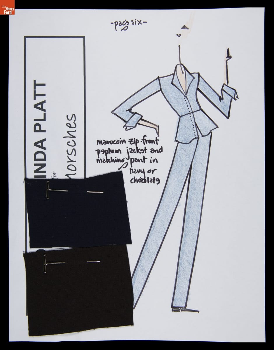 New York designers Tom and Linda Platt believe great clothes should be simple. The couple's timeless designs -- with streamlined silhouettes, bold details, and daring colors -- transcend trends and fashion obsolescence, and are at home in small-town America or cosmopolitan city. This album contains Platt sketches and fabric samples for their client Winifred Jones Morsches, a wealthy woman from a small Indiana town.