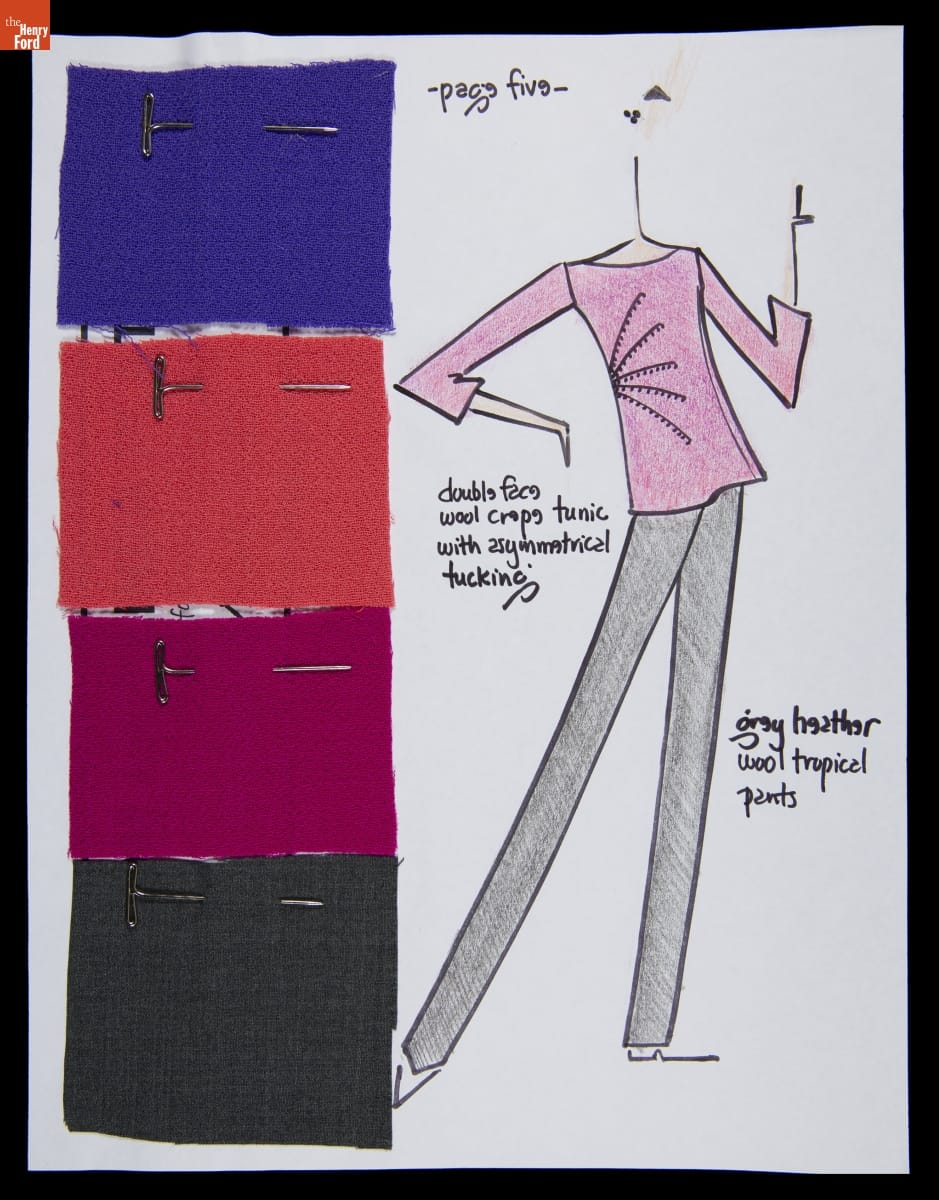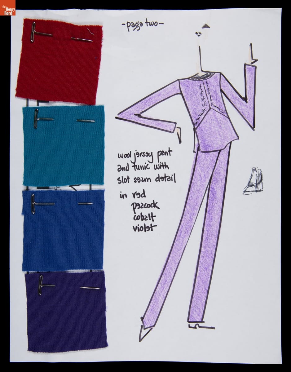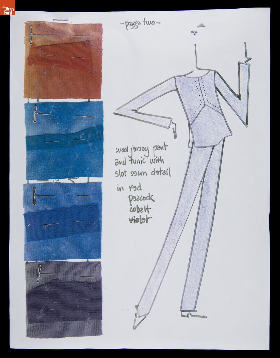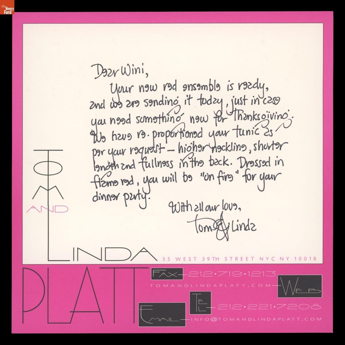New York designers Tom and Linda Platt believe great clothes should be simple. The couple's timeless designs -- with streamlined silhouettes, bold details, and daring colors -- transcend trends and fashion obsolescence, and are at home in small-town America or cosmopolitan city. This album contains Platt sketches and fabric samples for their client Winifred Jones Morsches, a wealthy woman from a small Indiana town.
