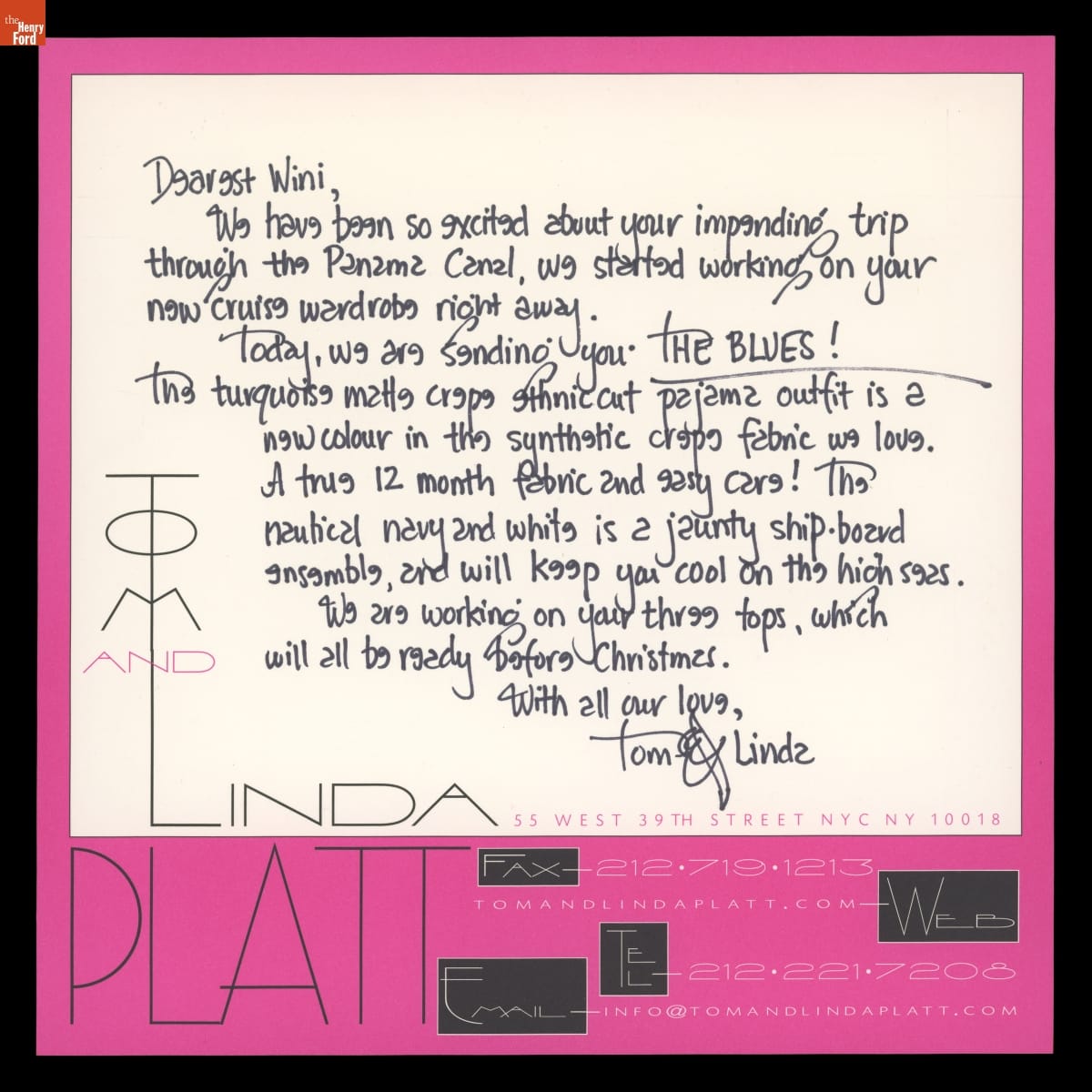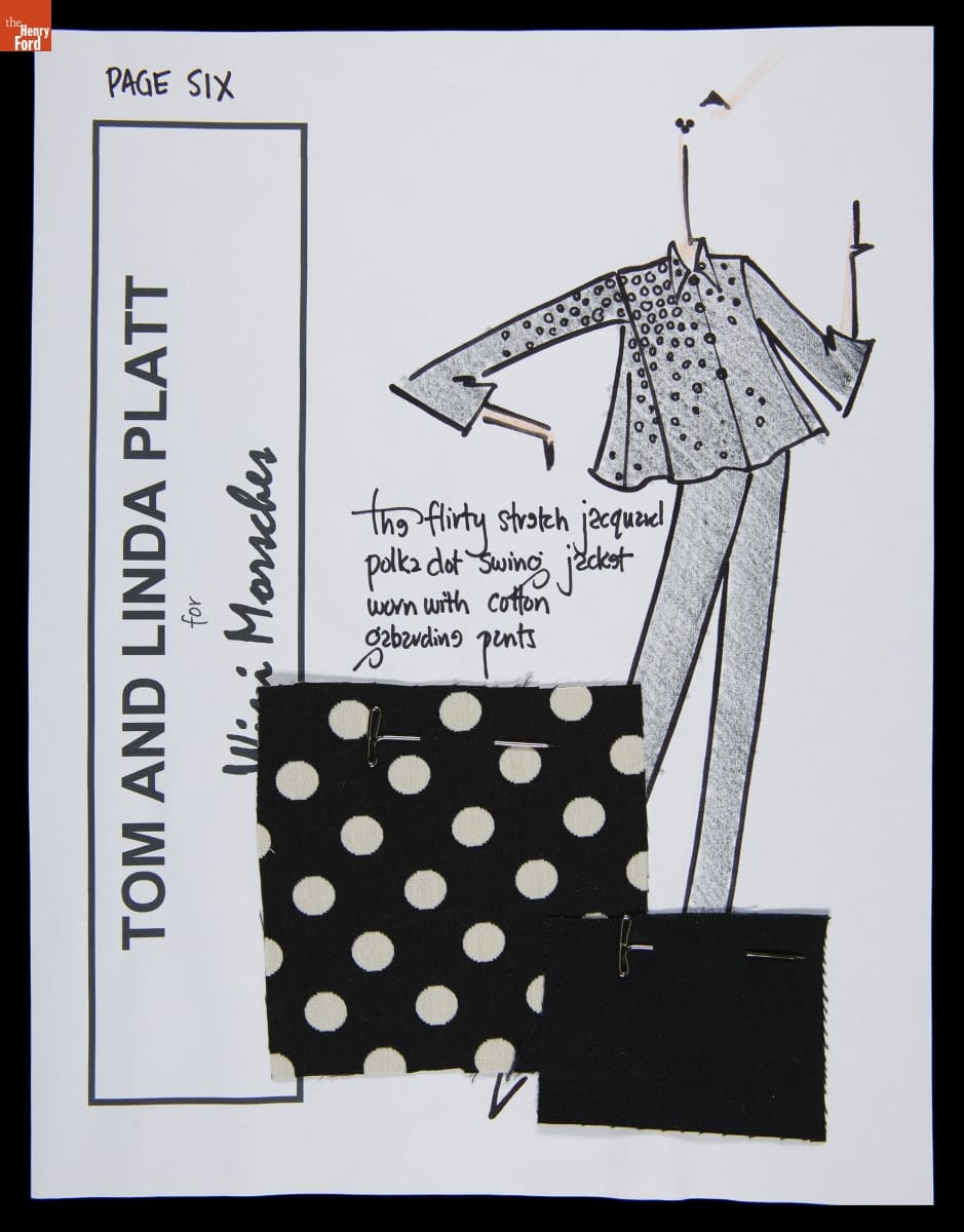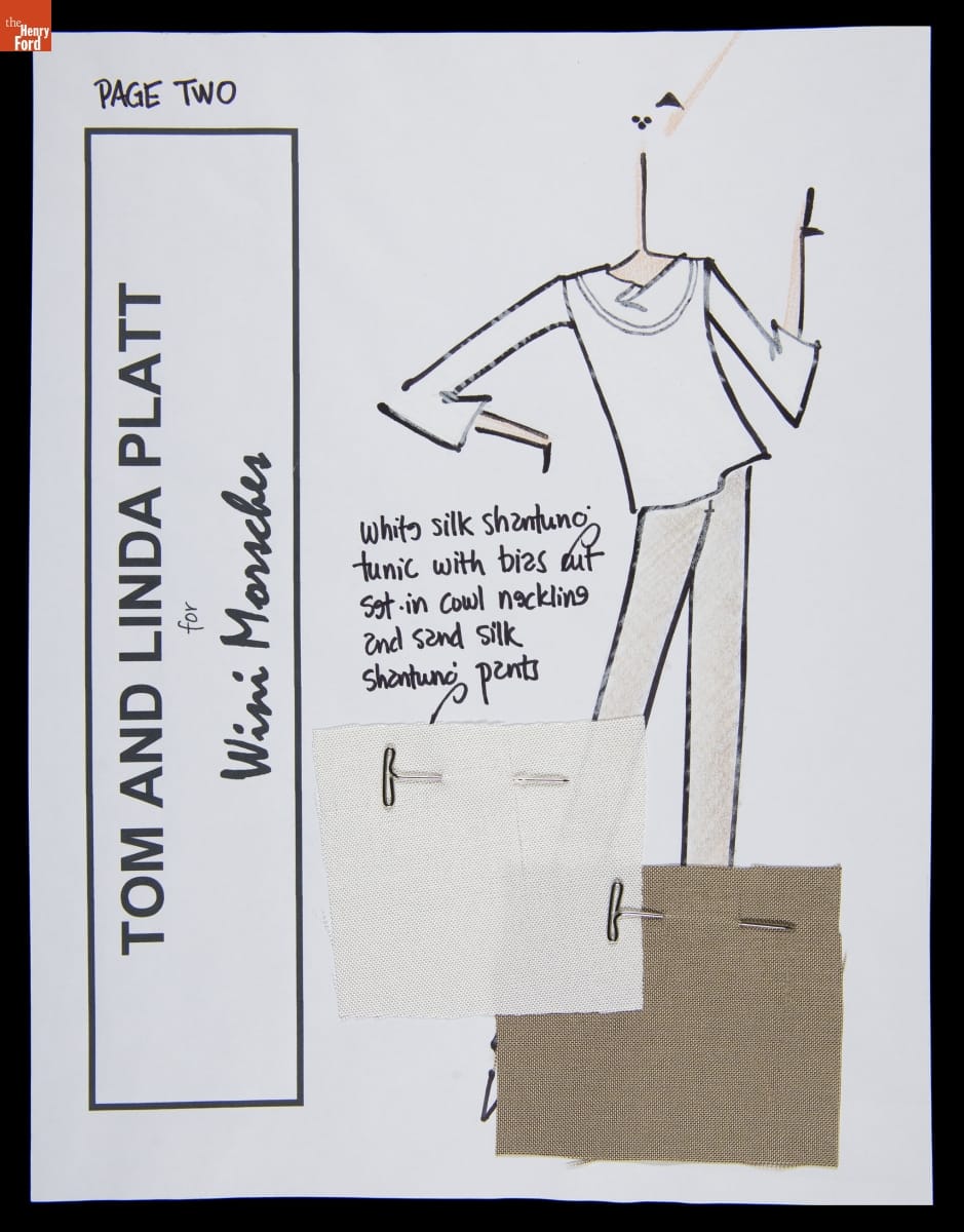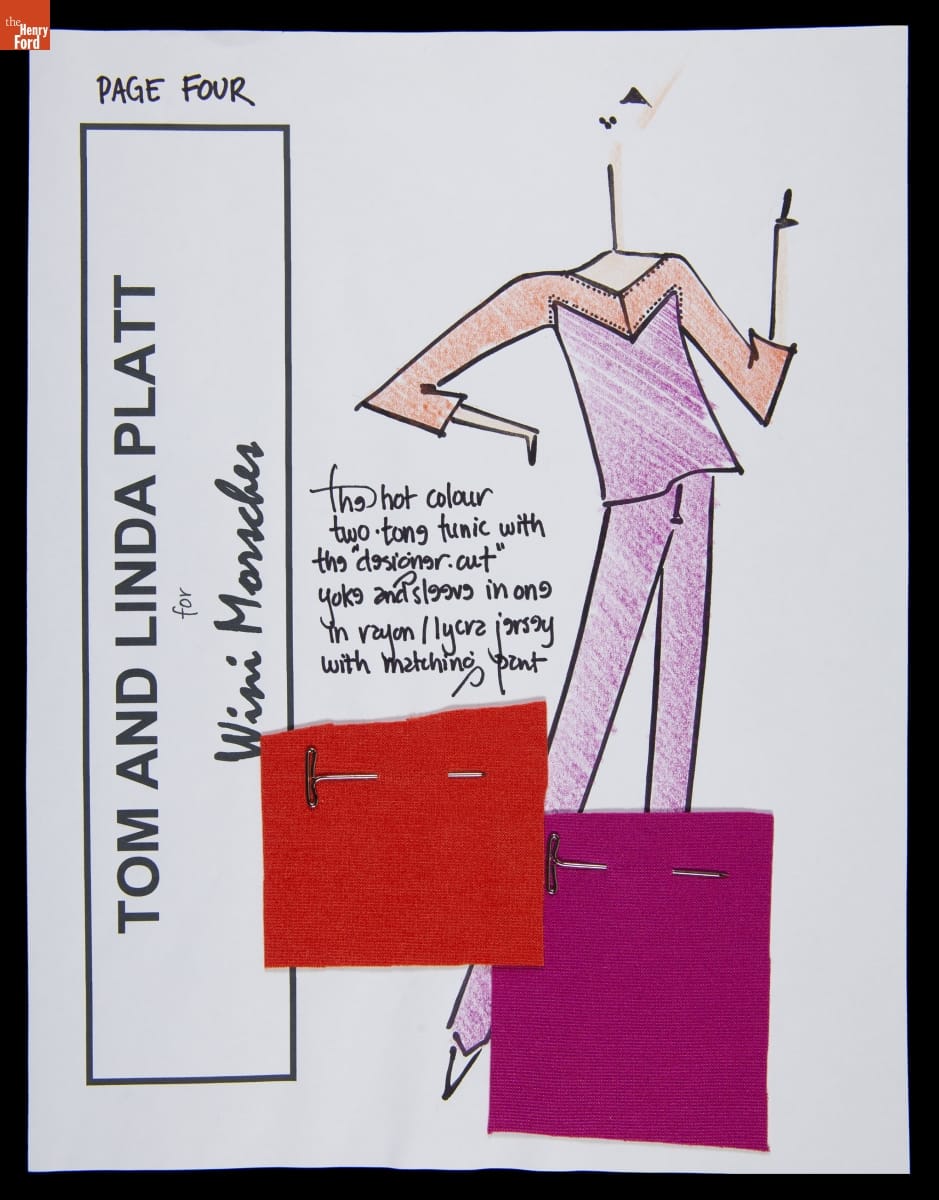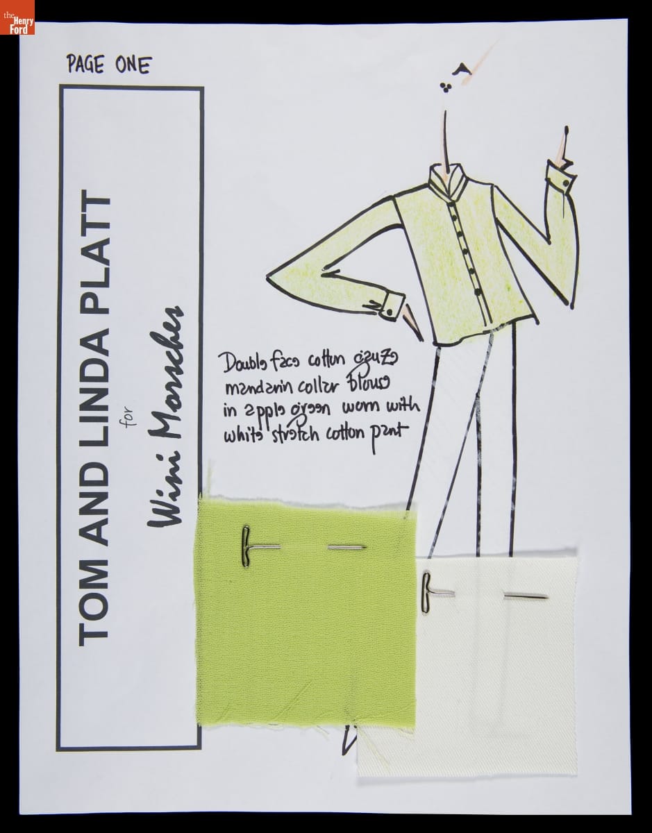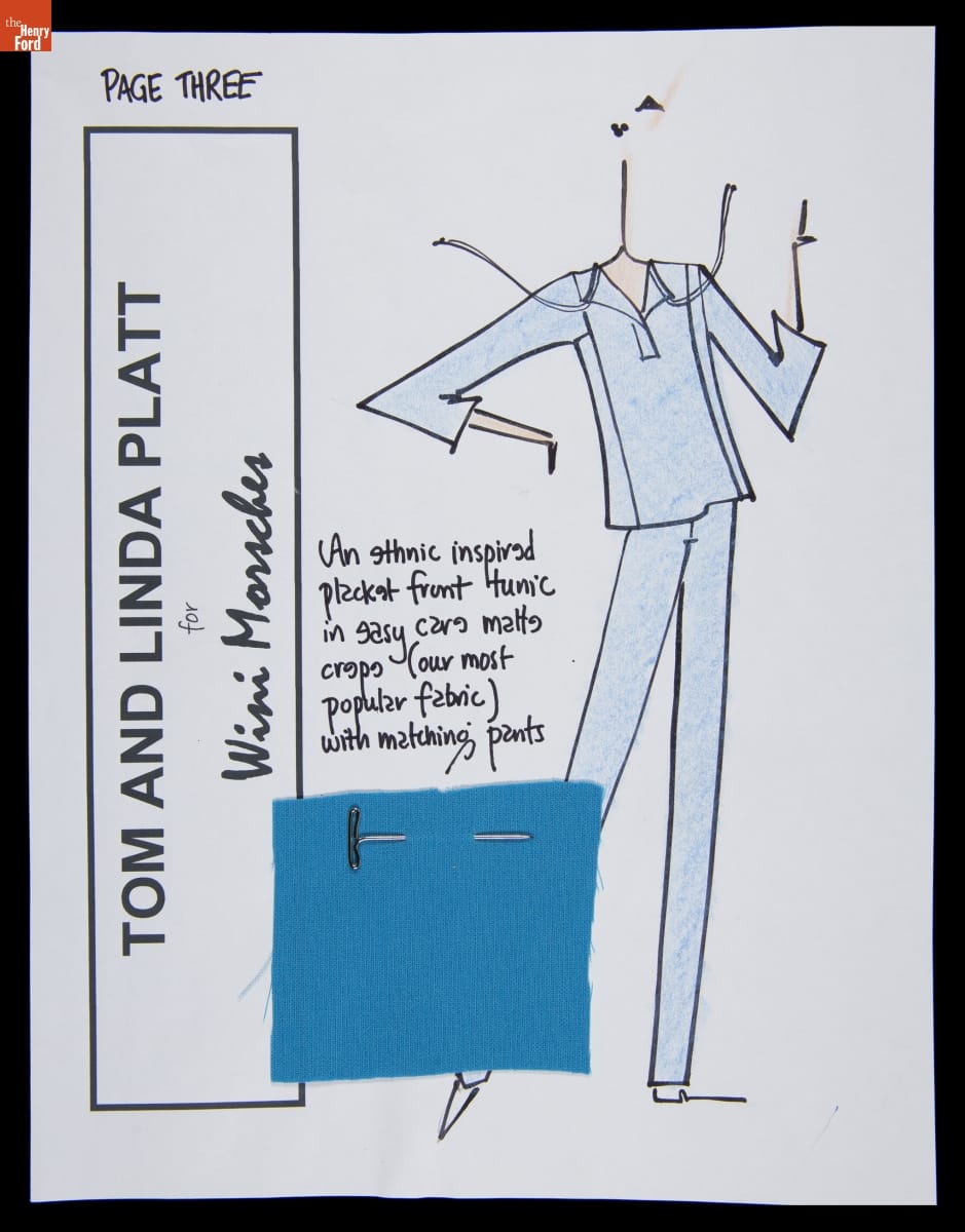 New York designers Tom and Linda Platt believe great clothes should be simple. The couple's timeless designs -- with streamlined silhouettes, bold details, and daring colors -- transcend trends and fashion obsolescence, and are at home in small-town America or cosmopolitan city. This album contains Platt sketches and fabric samples for their client Winifred Jones Morsches, a wealthy woman from a small Indiana town.