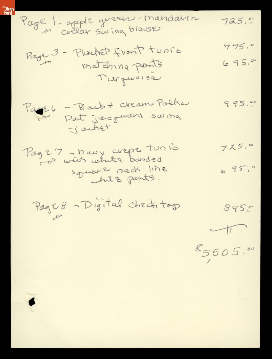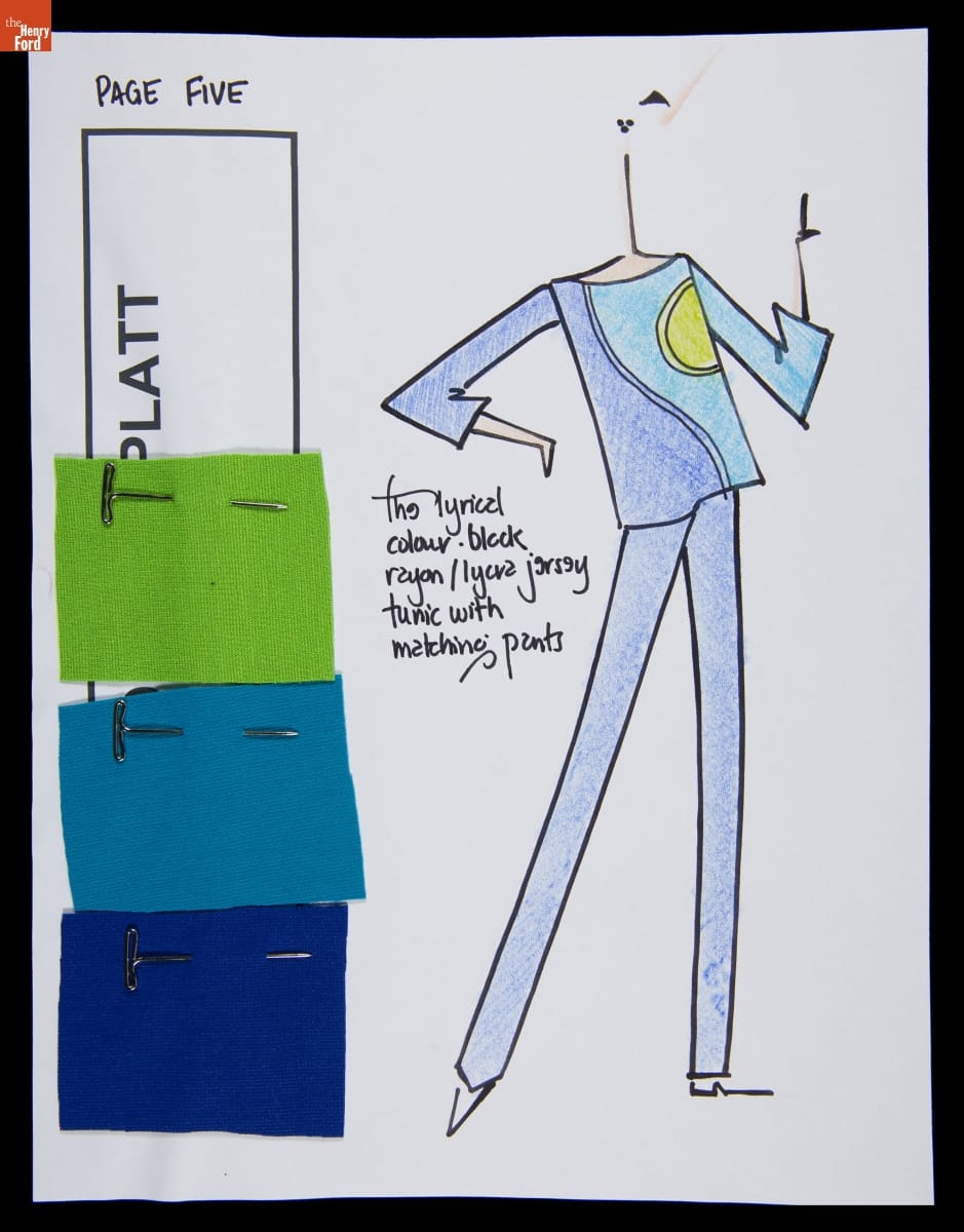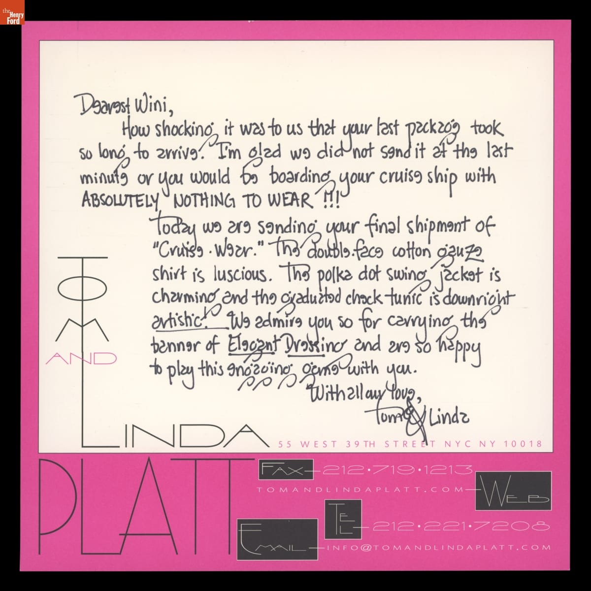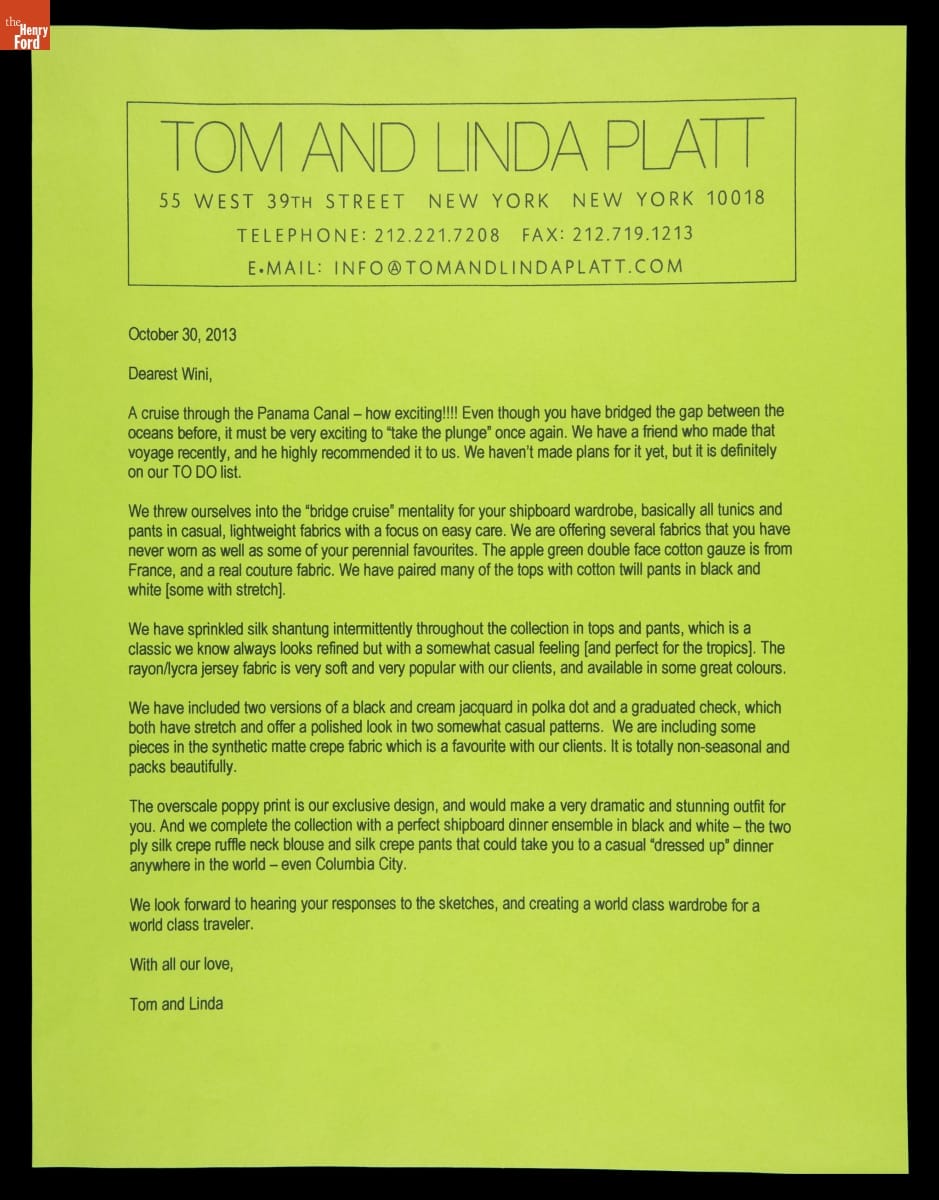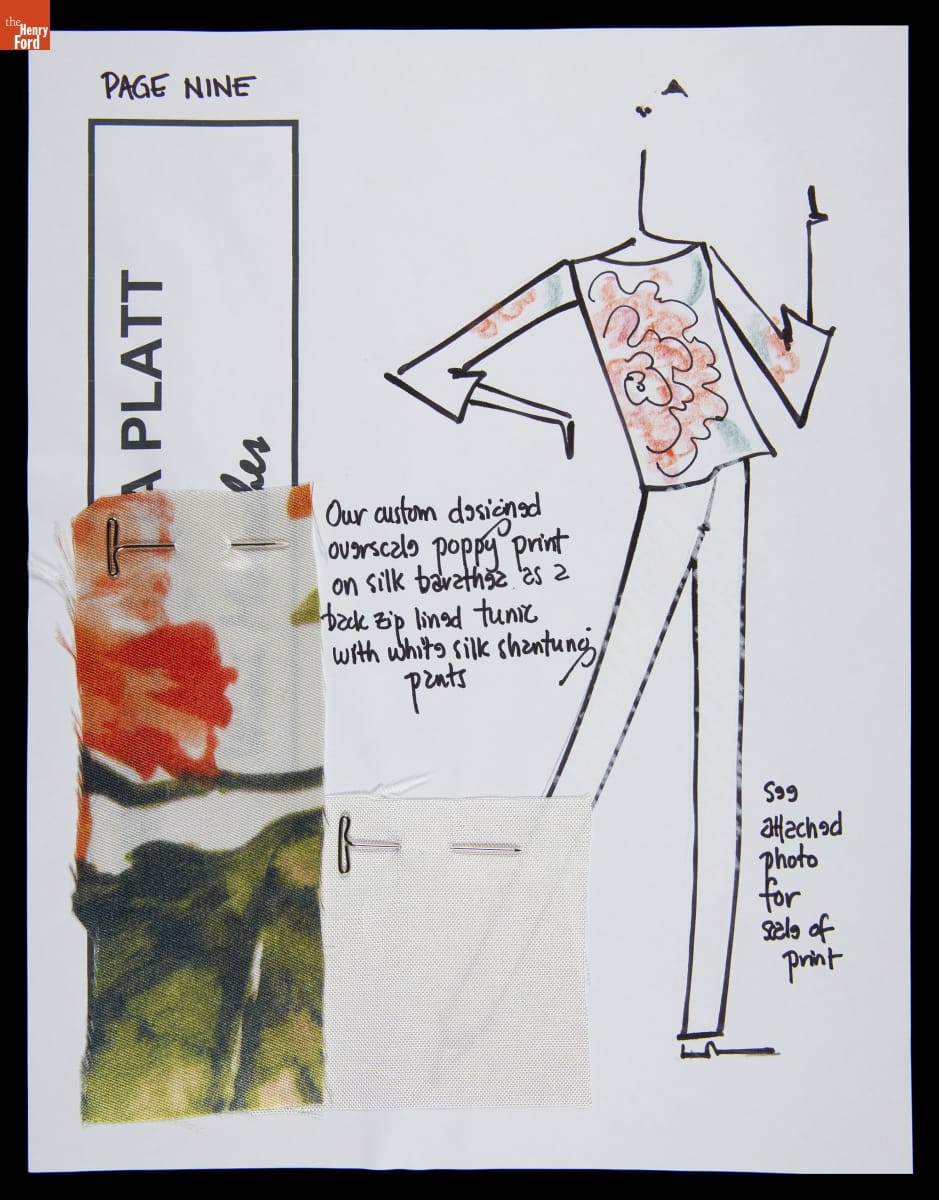 New York designers Tom and Linda Platt believe great clothes should be simple. The couple's timeless designs -- with streamlined silhouettes, bold details, and daring colors -- transcend trends and fashion obsolescence, and are at home in small-town America or cosmopolitan city. This album contains Platt sketches and fabric samples for their client Winifred Jones Morsches, a wealthy woman from a small Indiana town.