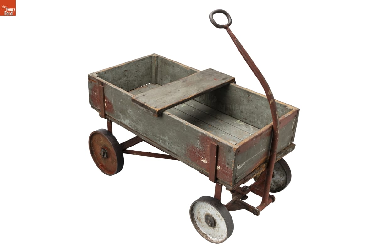 Cleoda Davis, a pipe fitter at a Detroit, Michigan chemical company, built this wagon during World War II for his son Allen. Davis used scrap wood and salvaged metal from work. Wartime restrictions limited resources like rubber and metal for toys, and many companies had switched from creating civilian goods to producing materials essential to the war effort.
