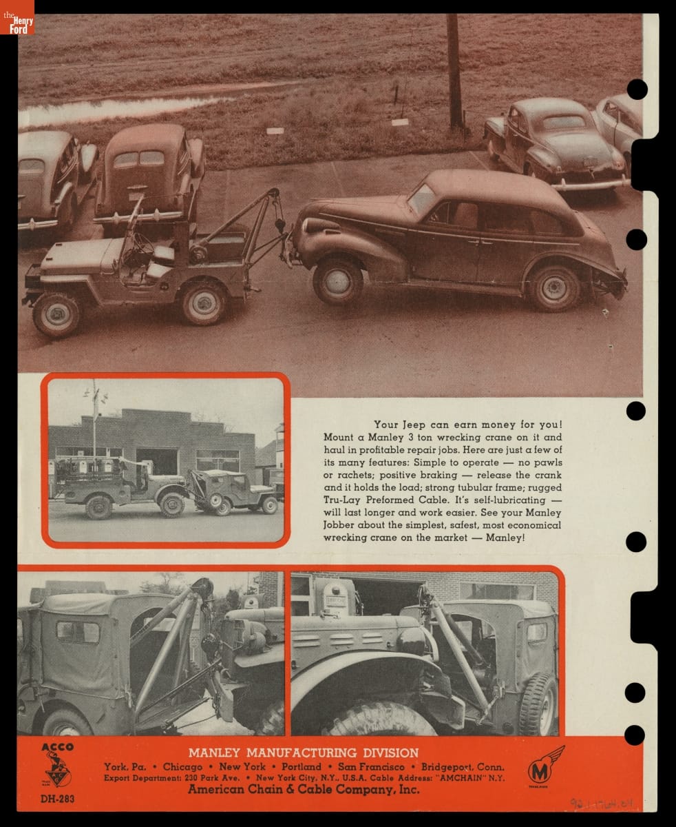 Manley Jeep Wrecking Crane Trade Literature, 1946