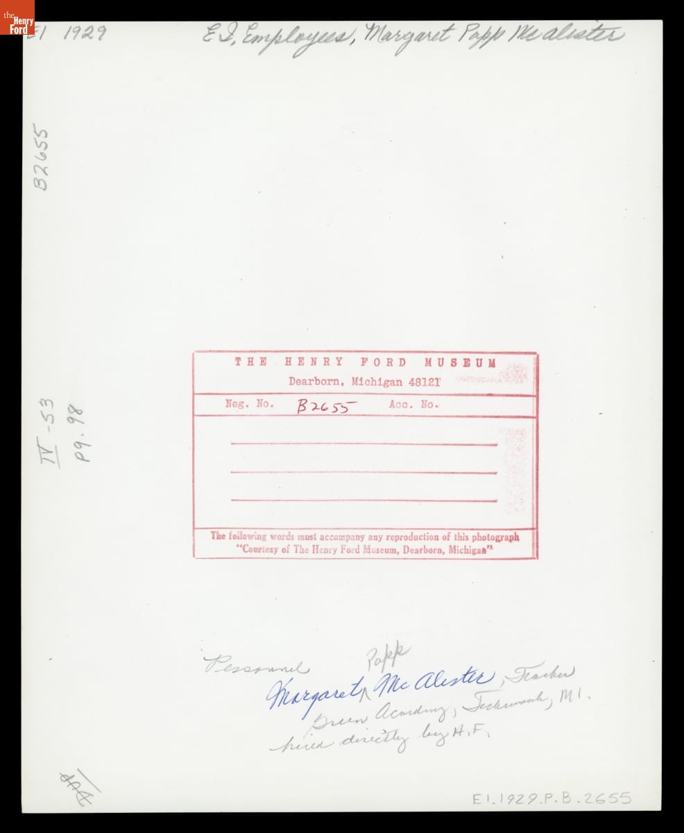Margaret McAlister began teaching at Henry Ford's schools in Mason and Tecumseh, Michigan, in 1933 and moved to the Greenfield Village school in 1943. She later served in the Edison Institute's School Services division before retiring as manager of Adult Education in 1981. McAlister was noted for her artwork, and her drawings graced numerous pamphlets, catalogs, calendars, and other publications.