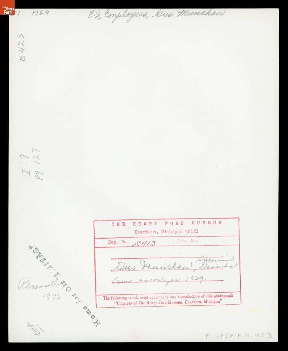 Gustav Munchow became the gardener at Henry and Clara Ford's Fair Lane estate in Dearborn, Michigan, around 1930, after emigrating from Germany. Soon after, Henry asked him to landscape the gardens of the Cotswold Cottage, an English cottage Ford had recently moved to Greenfield Village. Munchow's work impressed the Fords. Munchow later led the grounds and maintenance departments for the Museum and Greenfield Village.