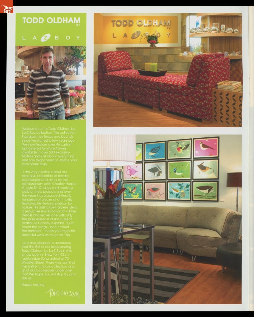 La-Z-Boy, America's largest upholstered furniture company, announced a partnership with popular designer Todd Oldham in 2003. From 2004-2007, the Todd Oldham by La-Z-Boy line offered sofas and chairs (including the iconic La-Z-Boy recliner), occasional furniture, and living and family room accessories designed for both fun and function. Oldham put a youthful spin on La-Z-Boy's classic home furnishings.
