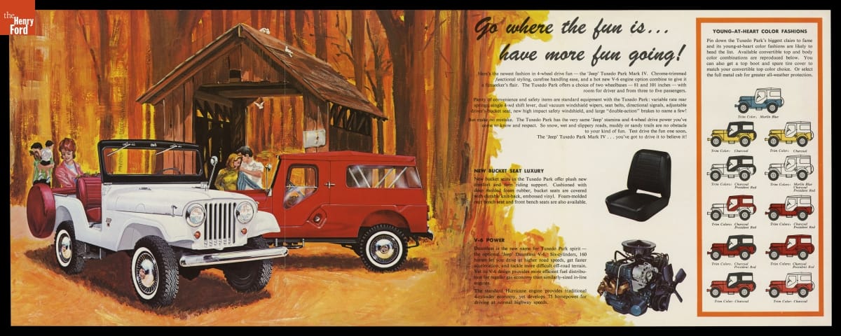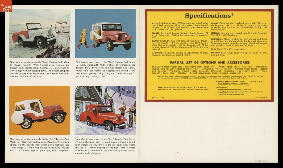 A glamorous Jeep? The Tuxedo Park, introduced as a trim package and later made a separate model, was just that. Based on the CJ series, the Tuxedo Park had a dressier appearance. Chrome sparkled on mirrors, hood latches, bumpers, and gas caps; fashionable interior colors coordinated with exterior paints; and available disc wheels and whitewall tires completed the look.