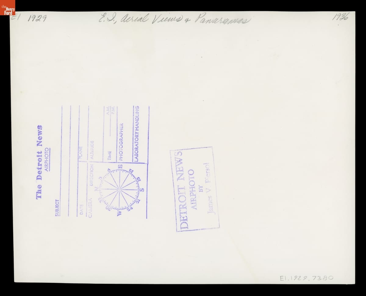 Auto magnate Henry Ford completed several major construction projects in Dearborn, Michigan. Many related to Ford Motor Company, but others were of personal interest. This aerial view shows Ford's historical village and a portion of the runway at Ford Airport. Ford himself lived nearby -- his estate, Fair Lane, is visible among trees at the top of the photograph.