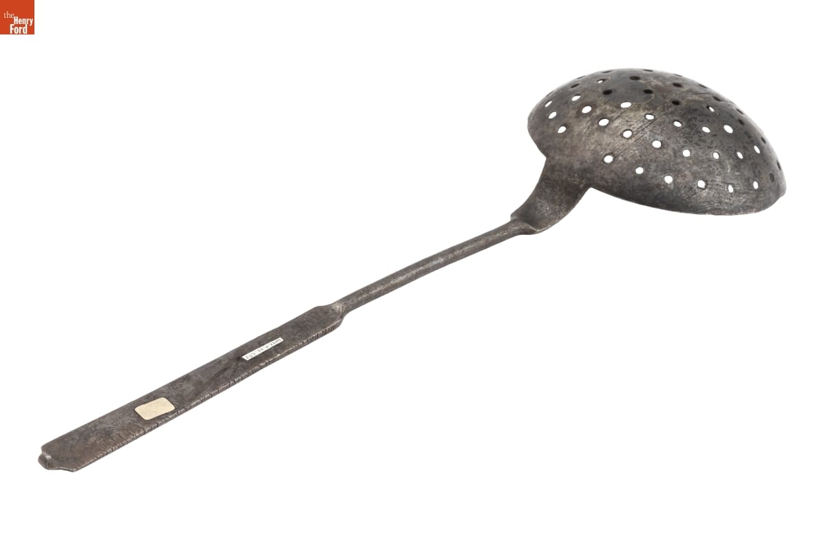 Cooks used flat sieves like this skimmer to remove foam that forms on the top of boiling liquids, or cream from the top of cooled whole milk. This skimmer consists of flattened sheet metal, pierced, and then riveted to a wrought-iron handle. Cooks kept the skimmer close-by, hanging it from a hook by the curve at the end of the handle.