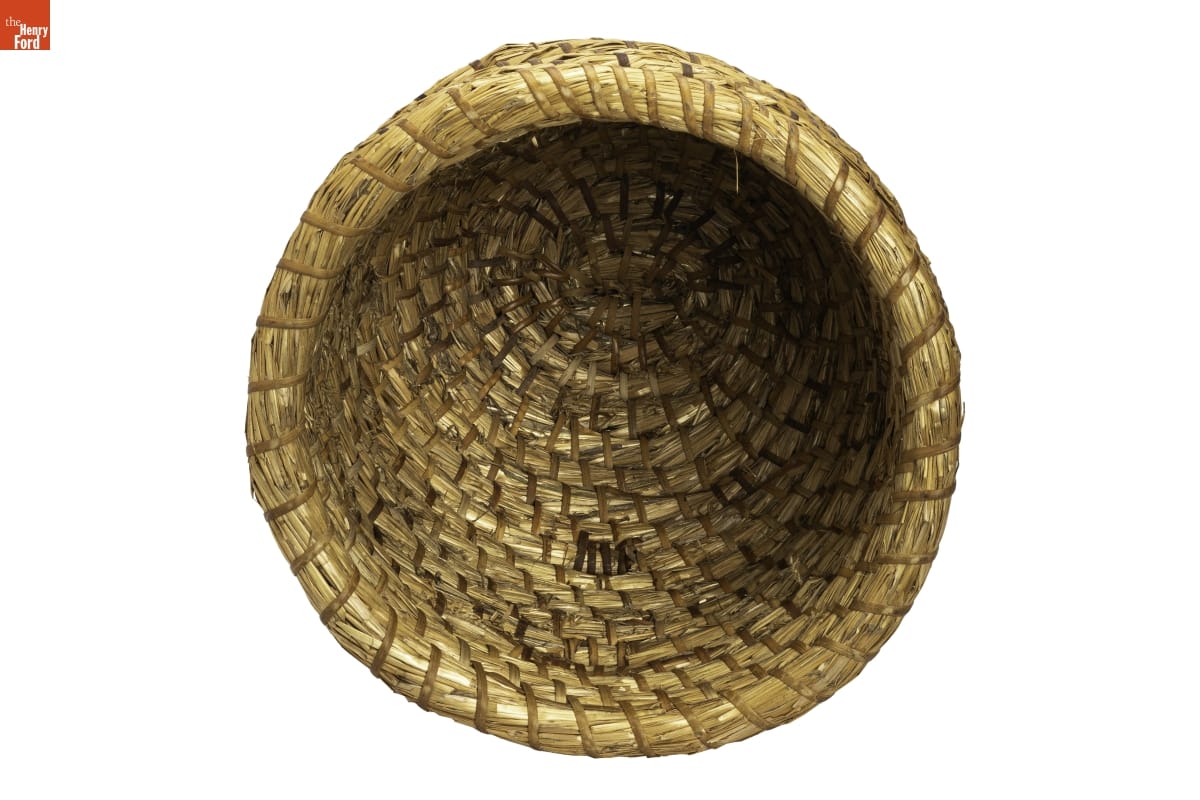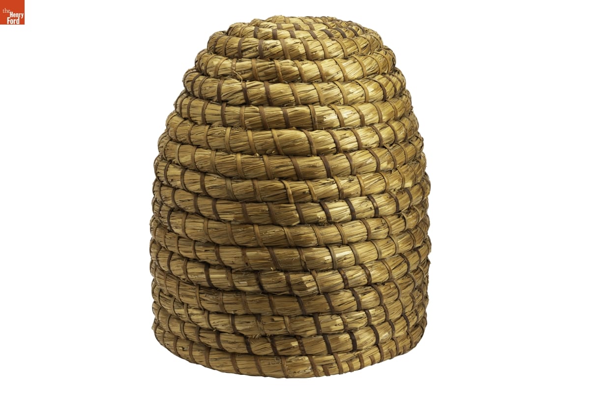 A bee skep provided shelter to domesticated honeybees. A skep consisted of coiled grain straw bound with wood splints. The small opening allowed bees to enter and make their honeycomb to store food to sustain the hive's bee larvae. Beekeepers put skeps near orchards, gardens, and fields with plants needing pollination and harvested the excess honey and beeswax.