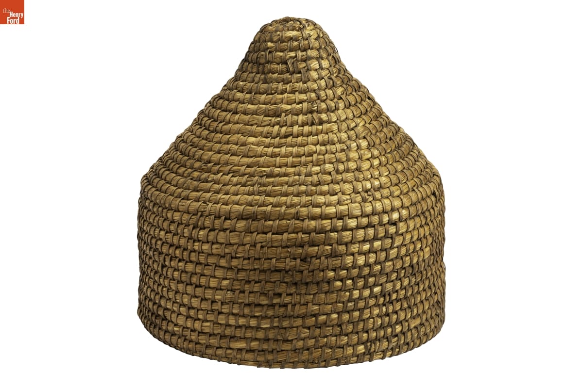 A bee skep provided shelter to domesticated honeybees. A skep consisted of coiled grain straw bound with wood splints. The small opening allowed bees to enter and make their honeycomb to store food to sustain the hive's bee larvae. Beekeepers put skeps near orchards, gardens, and fields with plants needing pollination and harvested the excess honey and beeswax.