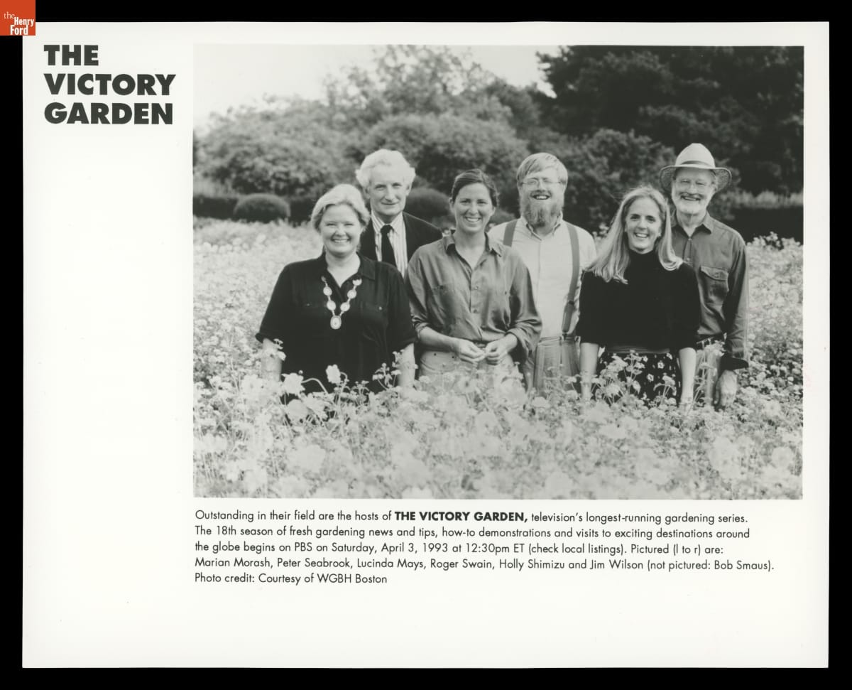 Text on front: THE VICTORY GARDEN / Outstanding in their field are the hosts of THE VICTORY GARDEN, television's longest running gardening series. / The 18th season of fresh gardening news and tips, how-to demonstrations and visits to exciting destinations around / the globe begins on PBS on Saturday, April 3, 1993 at 12:30pm ET (check local listings). Pictured (l to r) are: / Marian Morash, Peter Seabrook, Lucinda Mays, Roger Swain, Holly Shimizu, and Jim Wilson (not pictured: Bob Smaus) / Photo credit: Courtesy of WGBH Boston